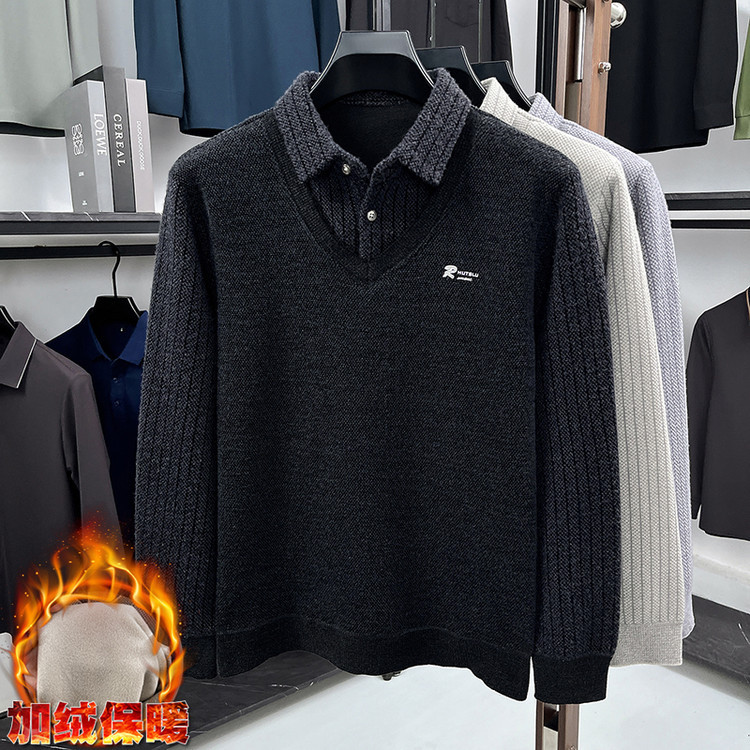 冬季爸爸装加绒毛衣衬衫领中年男式针织衫一体绒加厚男士保暖上衣