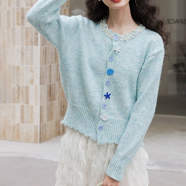 ヨーロッパの重工業の怠惰なスタイルの柔らかくワックスのようなミルクブルーの女性用セーター、2025年春と秋の新しいハイエンドの柔らかくワックスのようなニットカーディガン