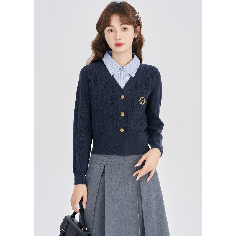 2025 秋と冬の新しい偽ツーピースニットセーター女性の新しい英国カレッジスタイルの女性のデザインセンストップジャケット