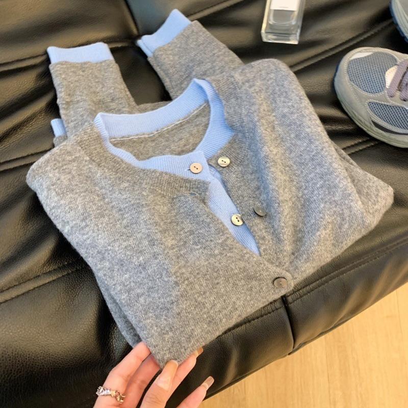 グレーとブルーのラウンドネックコントラストカラーフェイクツーピースセーター、女性用長袖カーディガン、2025年秋の新作韓国風ニットトップス