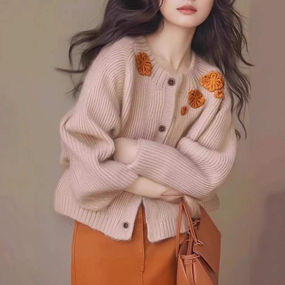韩系软糯开衫舒适牛角针织衫女秋冬复古刺绣设计感小众毛衣外套