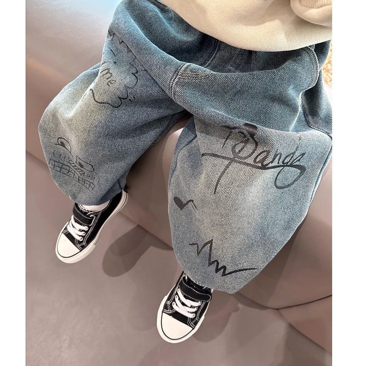 洋气涂鸦~男童宽松加绒软牛仔裤秋冬季中小童束脚一体绒保暖裤子