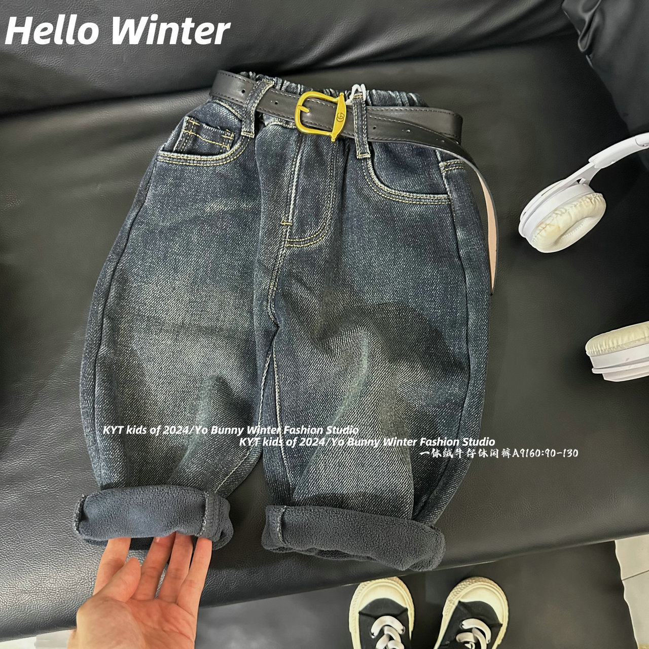 2025年冬新作 ソフトな男の子用子供用一体型フリースデニムパンツ トレンド感あふれるベビー用保温フリースパンツ