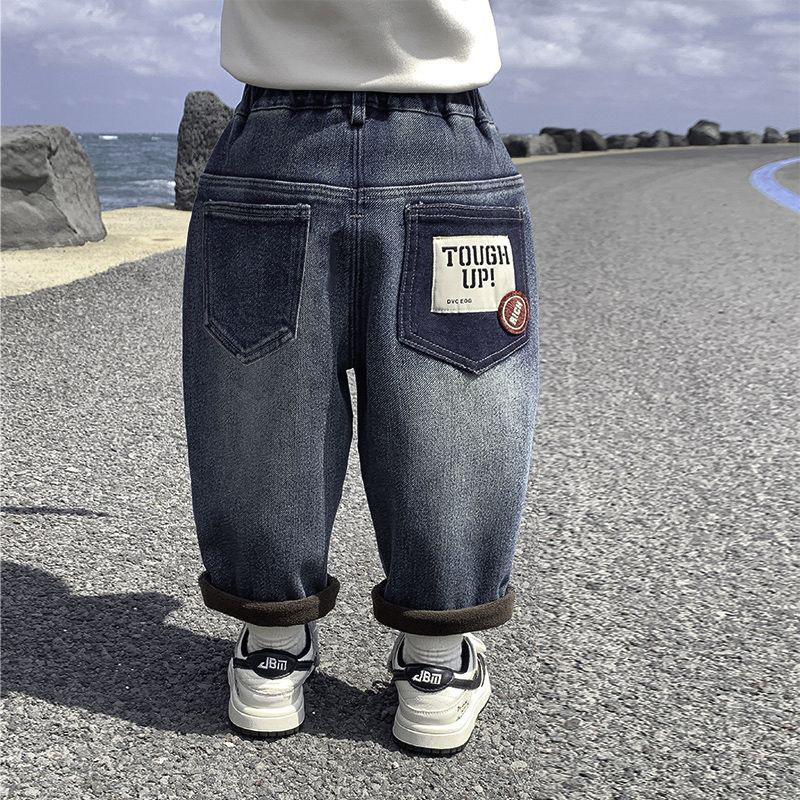 男の子用おしゃれな裏起毛デニムパンツ 秋冬用 2025年新作 女の子用厚手カジュアル冬服 子供用パンツ