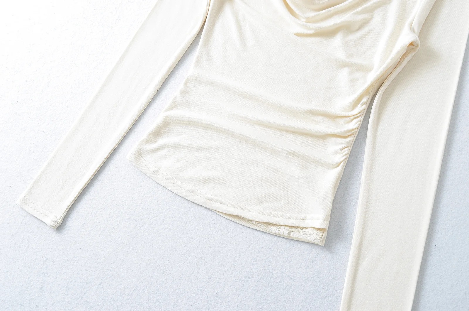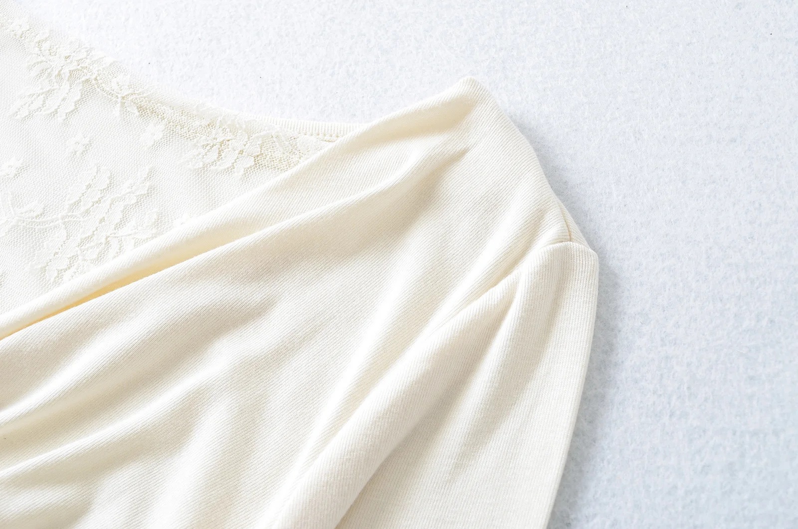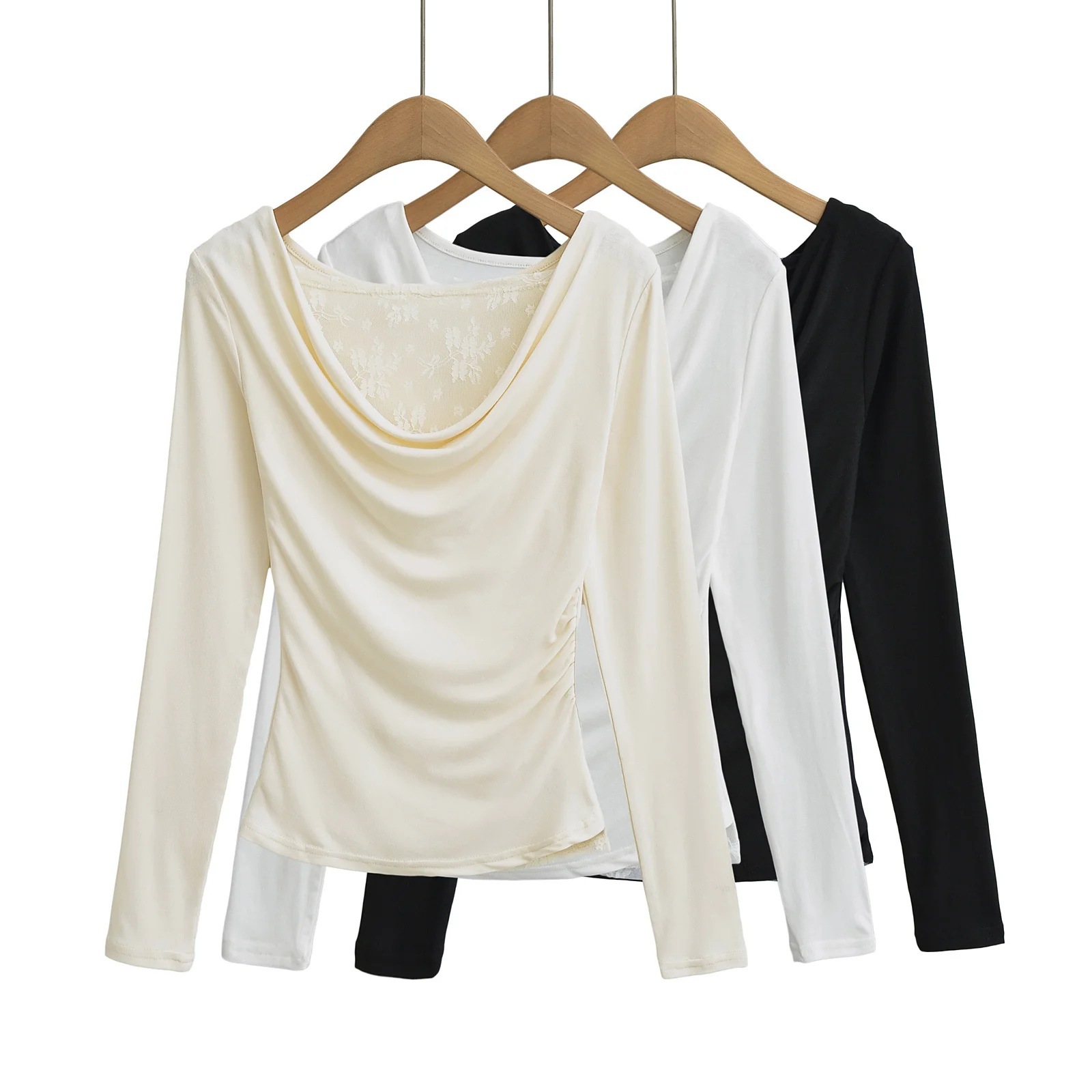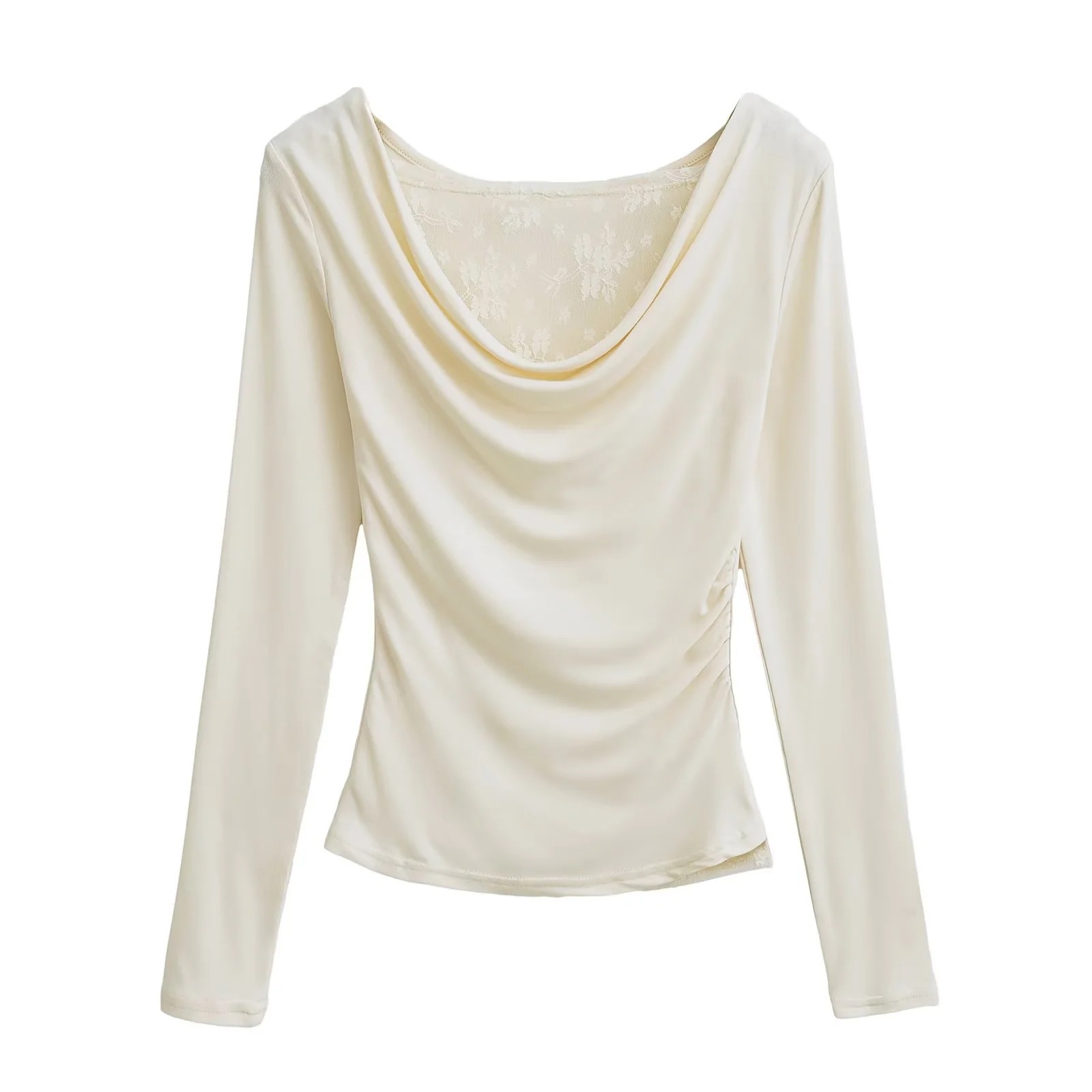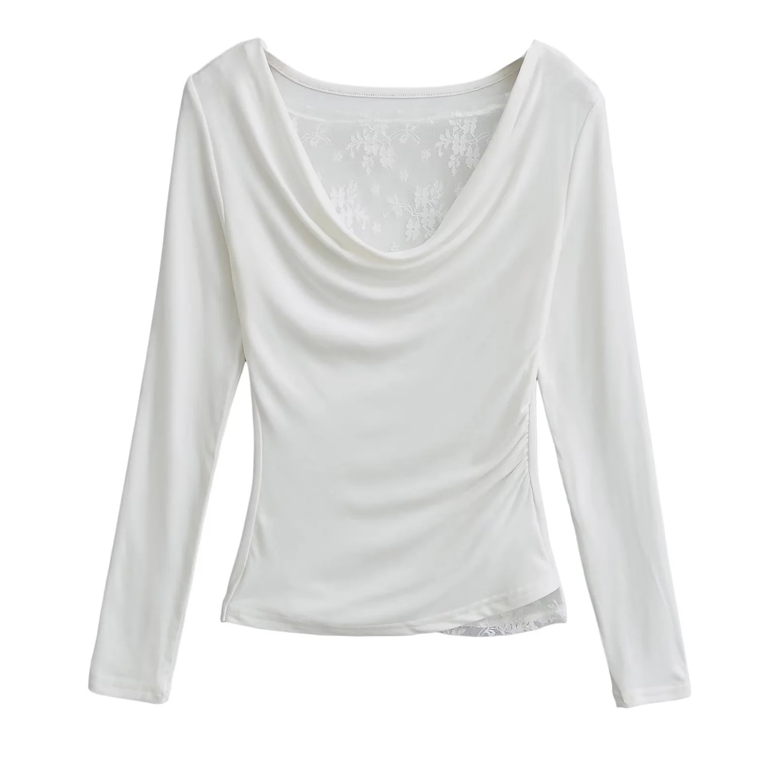 襟のデザイン感の斜め肩の肩の上着の秋の新型のしわはレースの底のシャツの長袖のtシャツの女性をつなぎ合わせます。