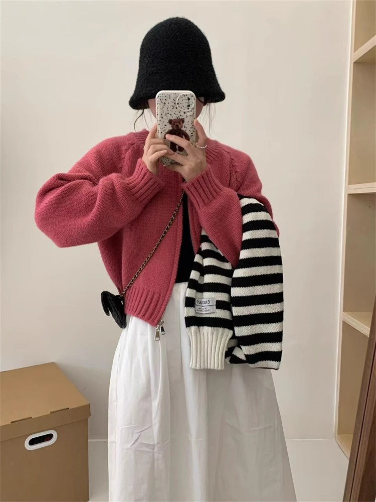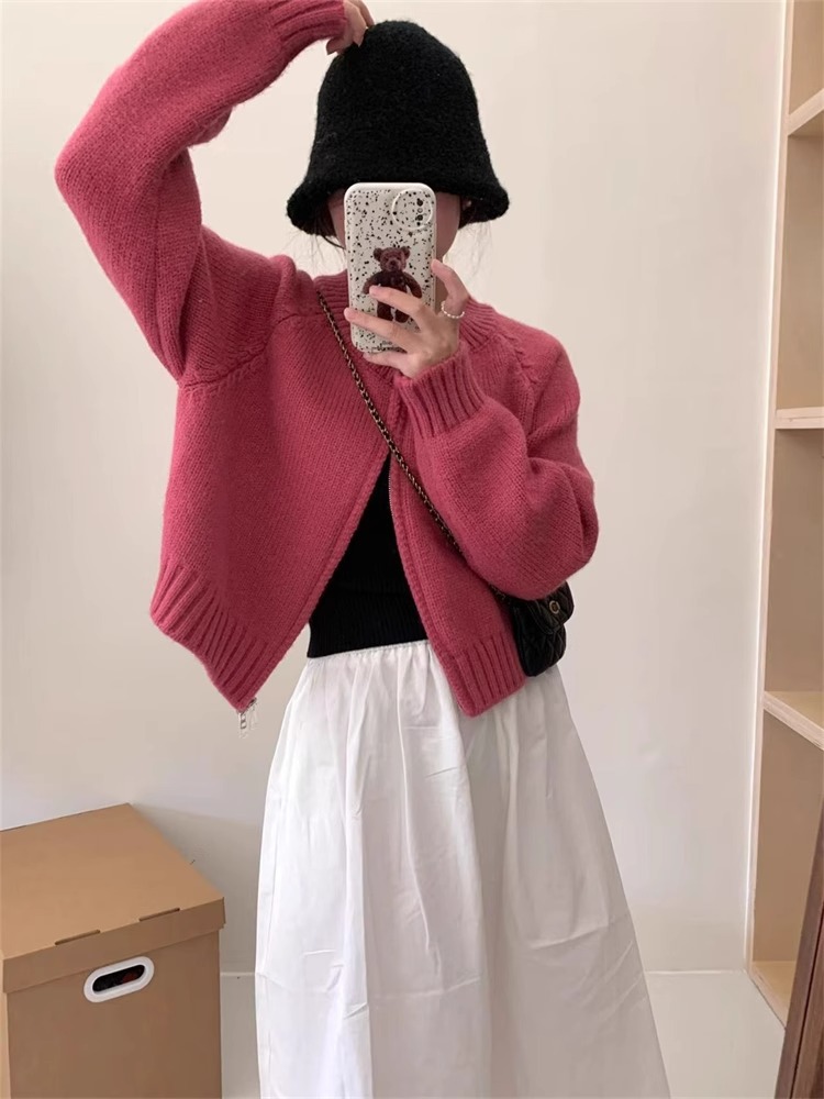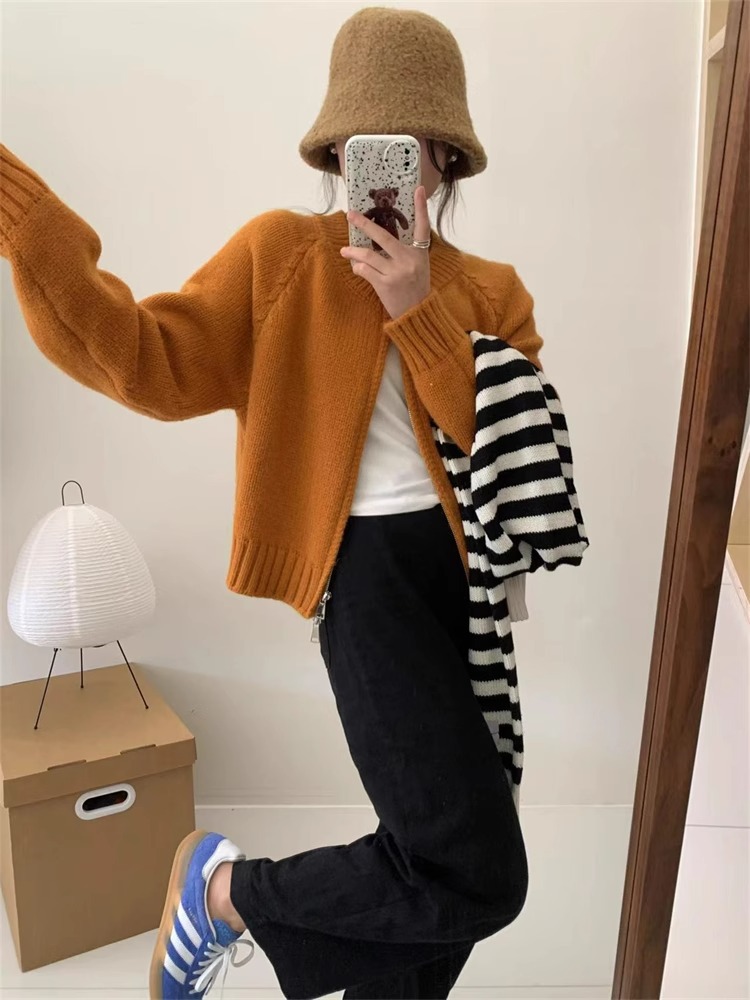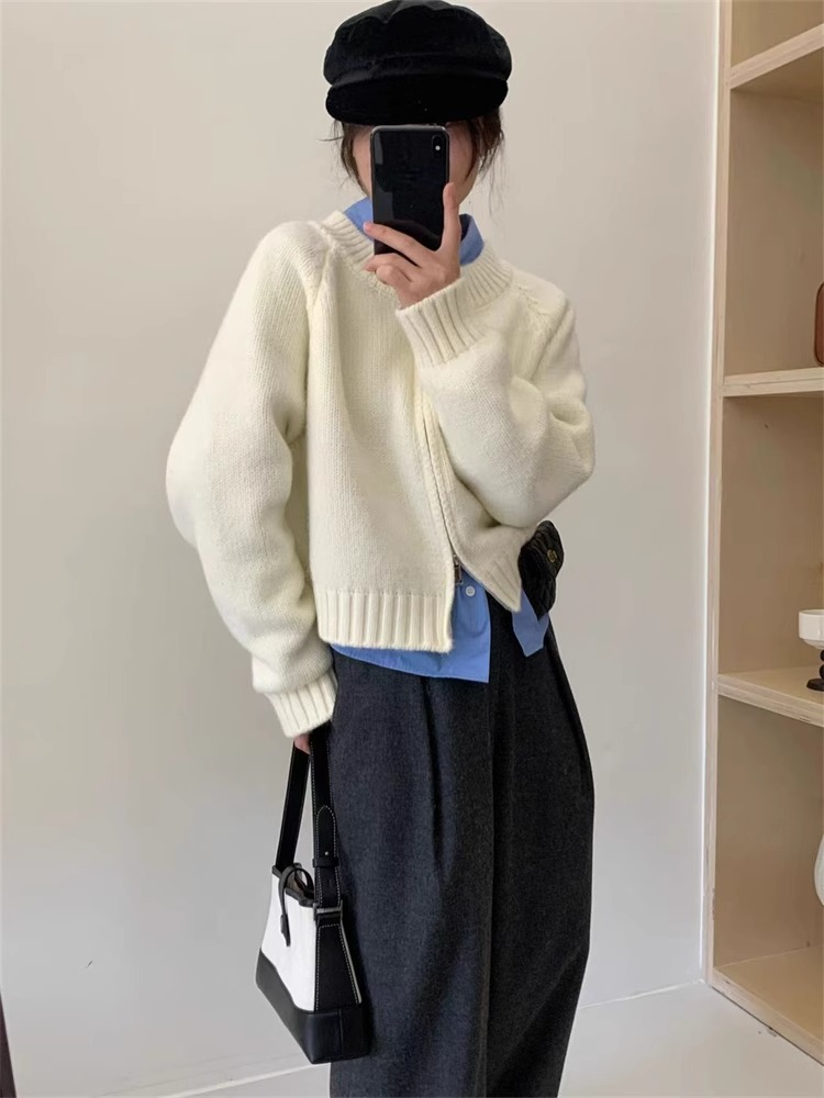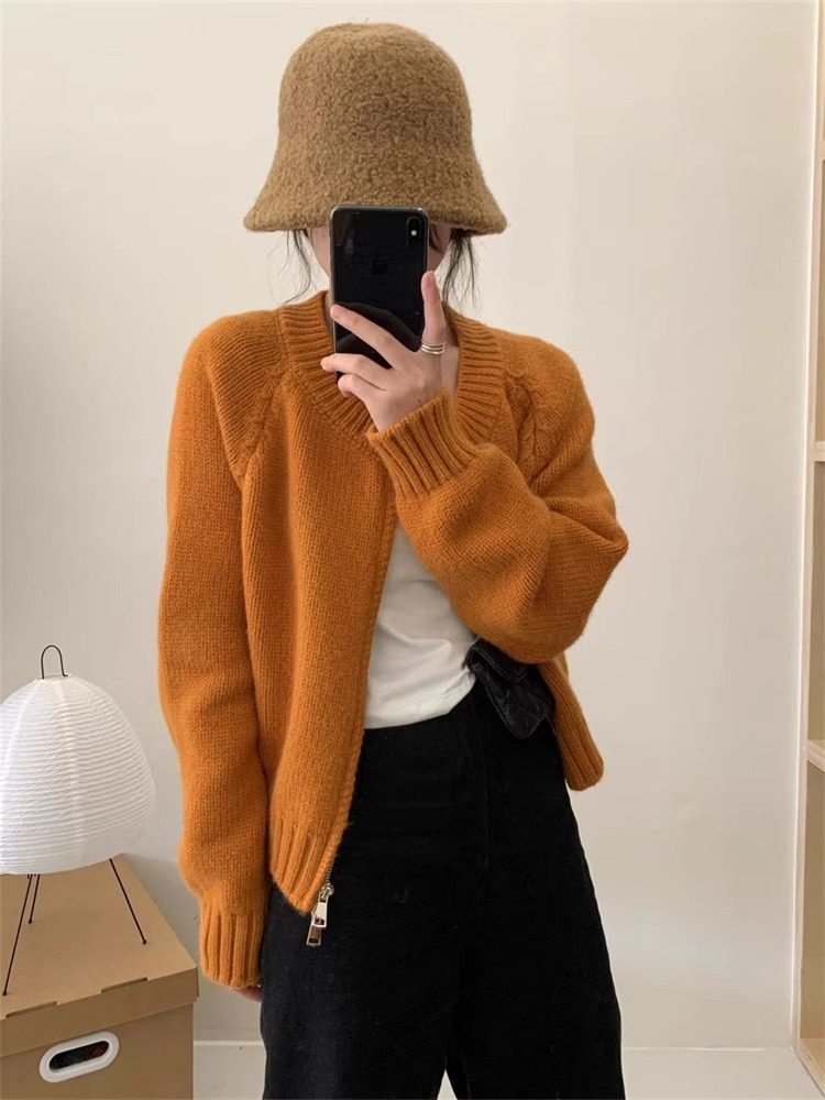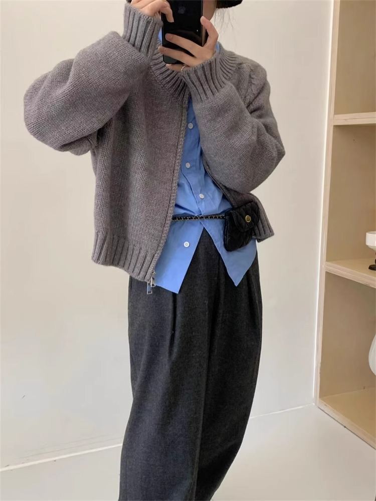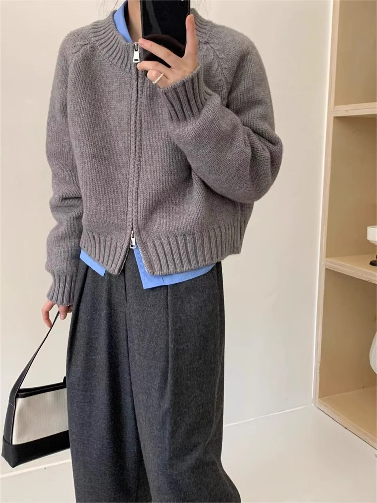 怠惰な風の双ファスナーのセーターのコートの女性の2024秋冬の短いデザイン感の小さい大衆のシンプルな韓系のニットのカーディガン