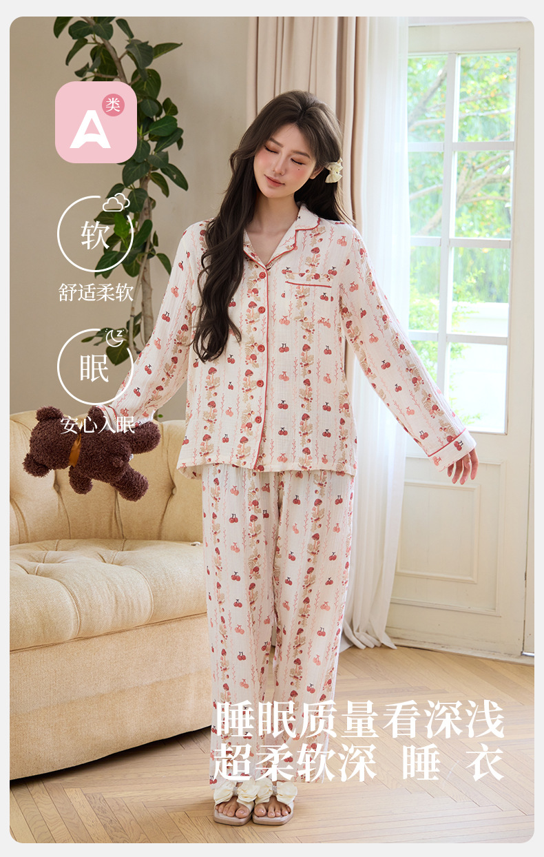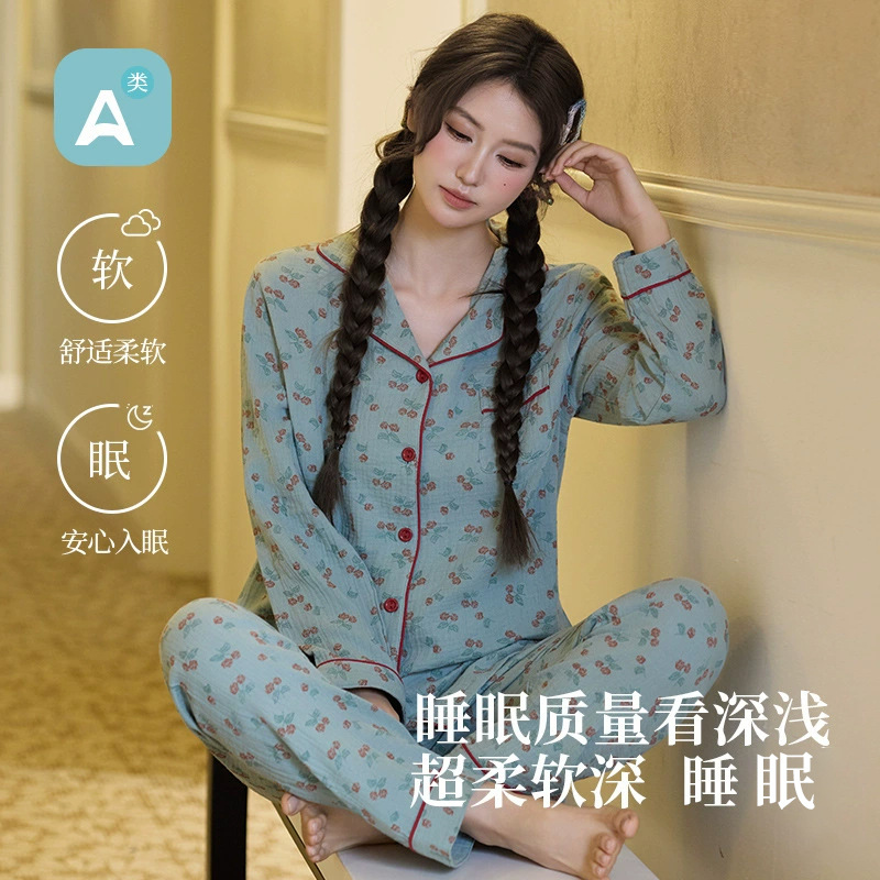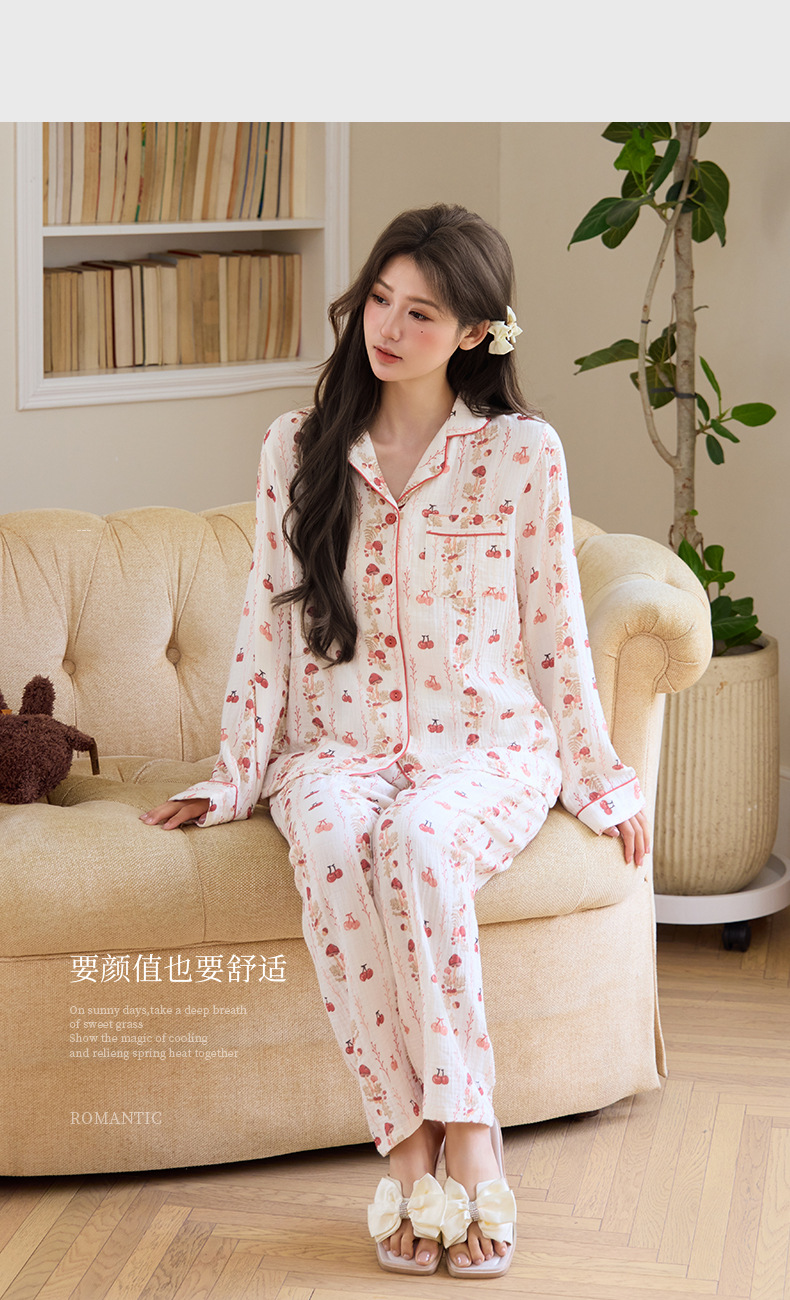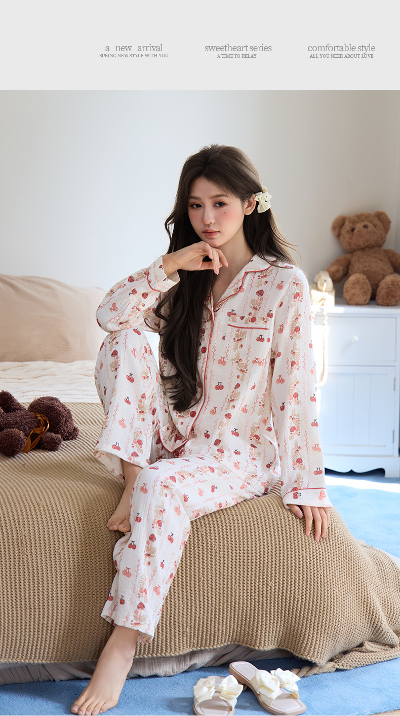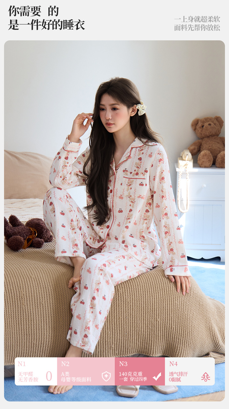 純綿二重ガーゼパジャマレディース新型森系さくらんぼ春秋長袖綿100% ゆったりホームウェアセット