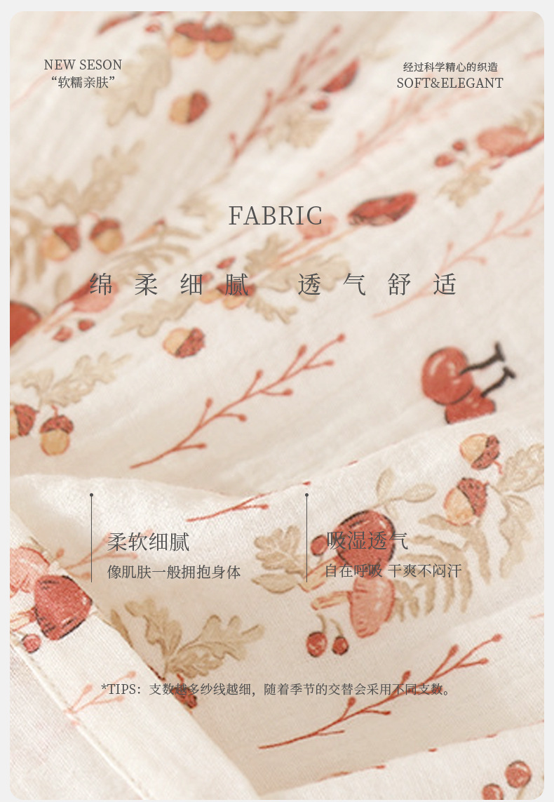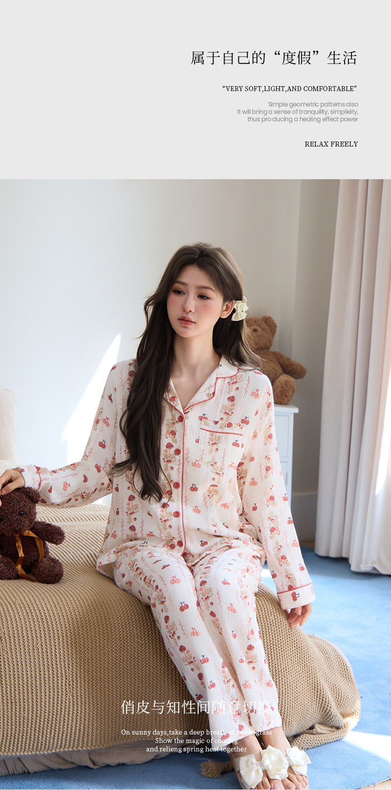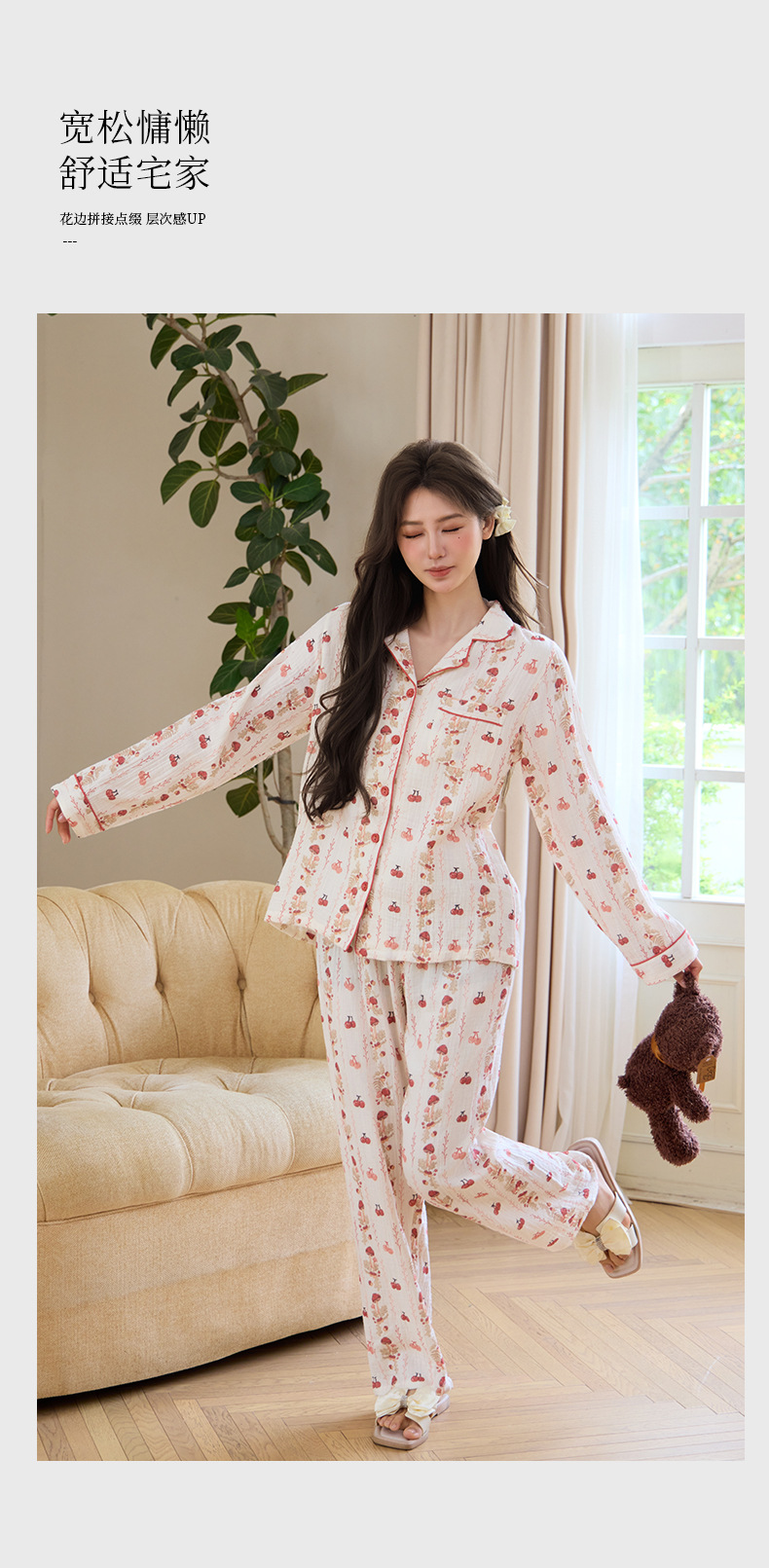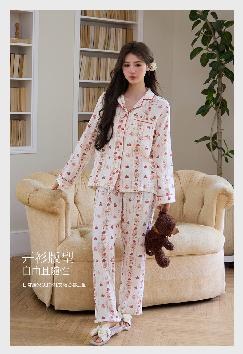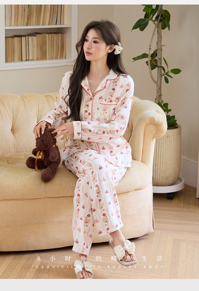 純綿二重ガーゼパジャマレディース新型森系さくらんぼ春秋長袖綿100% ゆったりホームウェアセット