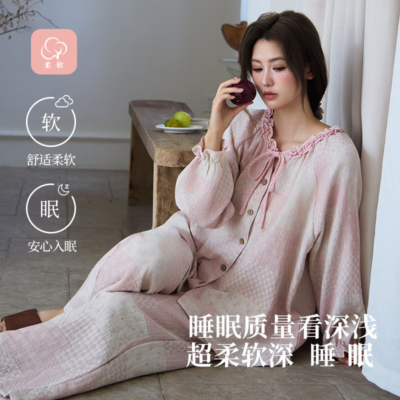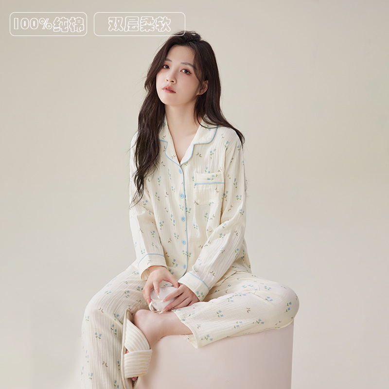 和風田園風純綿二重ガーゼレディースパジャマ春秋夏長袖薄手シンプルカジュアルホームウェア