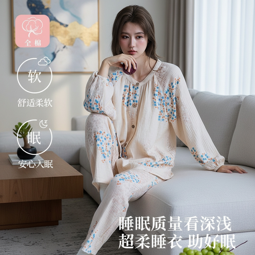 中国風パジャマ レディース 新中式 純綿二重ガーゼ 薄手 春秋 長袖 カスタムホームウェアセット 卸売