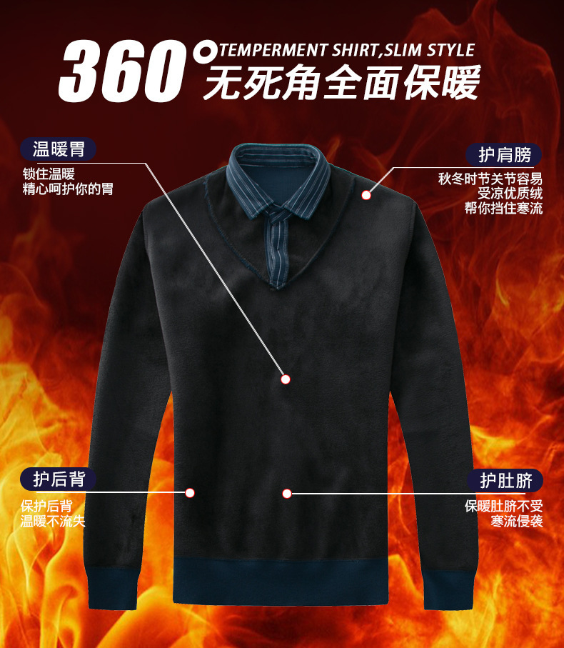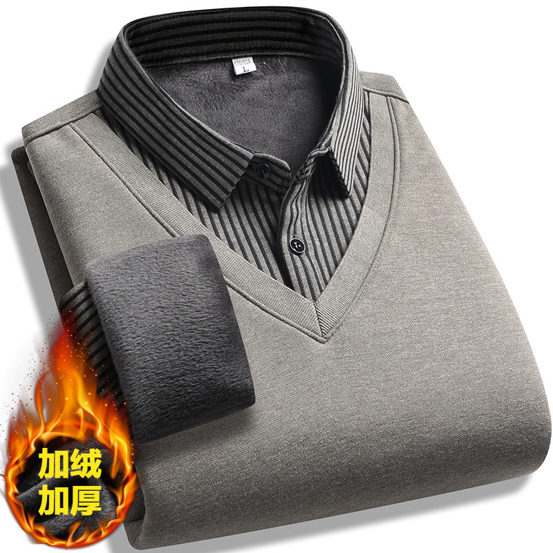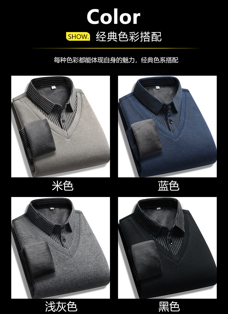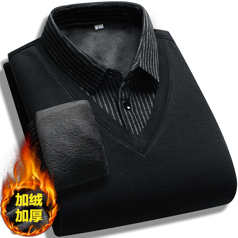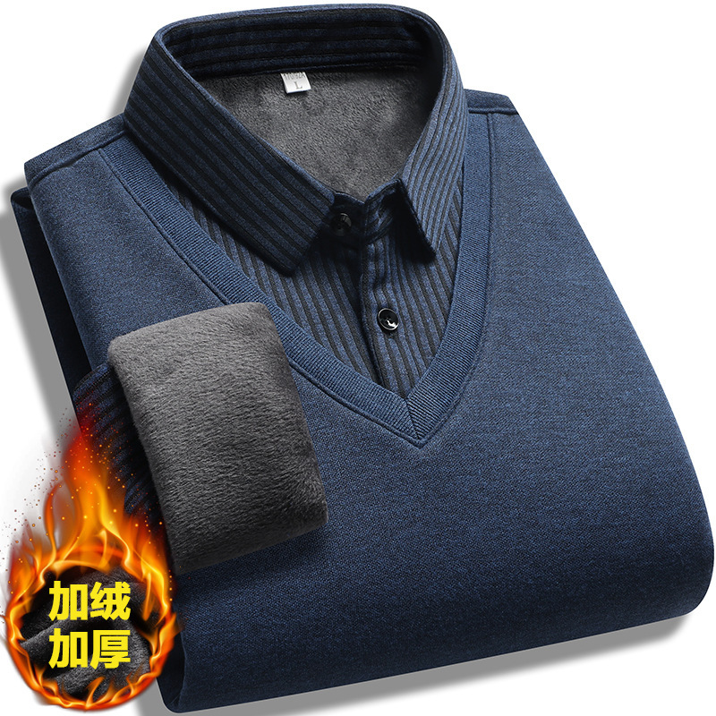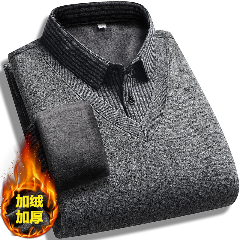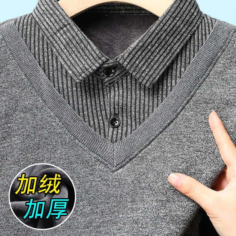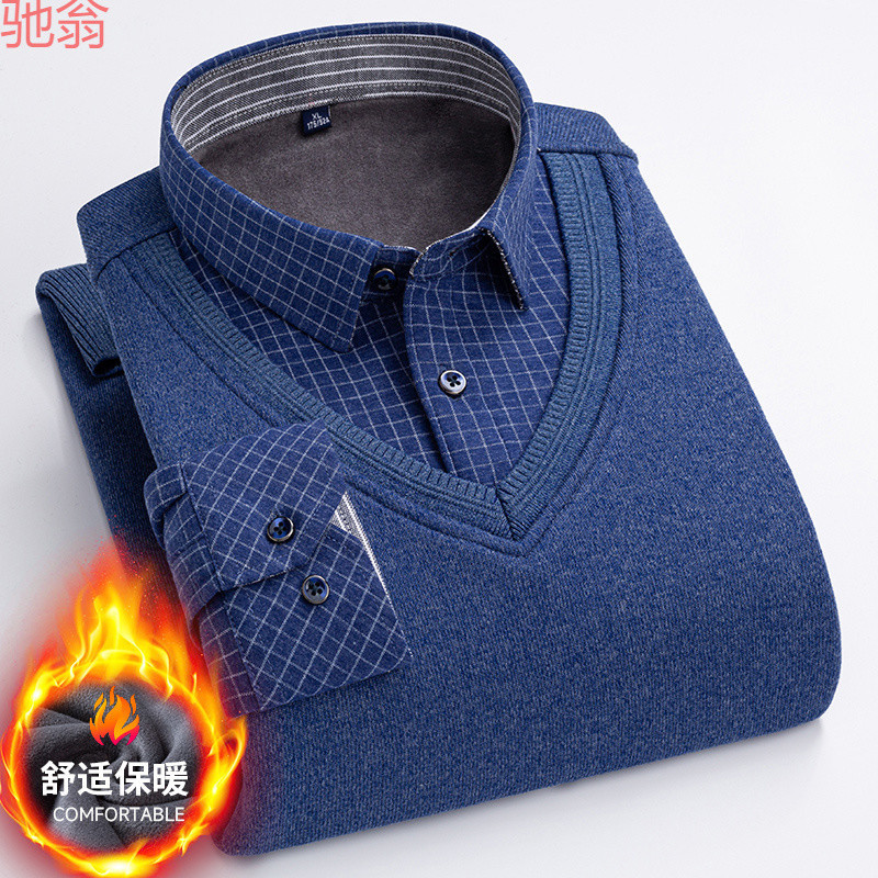 秋冬款男士加绒加厚中年毛衣爸爸装长袖衬衫领假两件中老年衬衣男