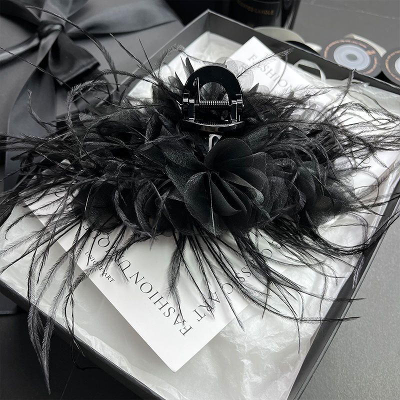 超仙多層花羽毛クリップ高級感秋冬顕髪量後頭部盤髪サメクリップ髪飾り女