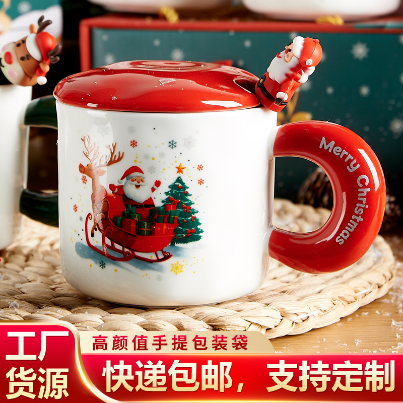 跨境可爱圣诞节陶瓷水杯卡通马克杯公司开业活动礼品带盖杯子定制