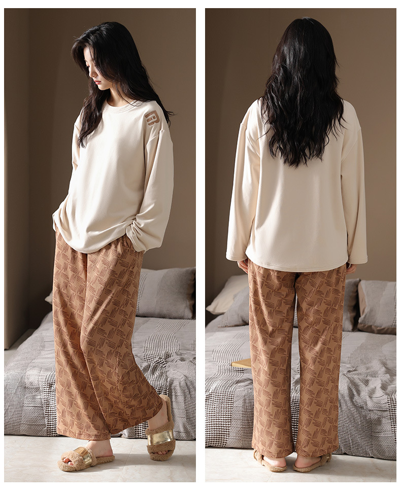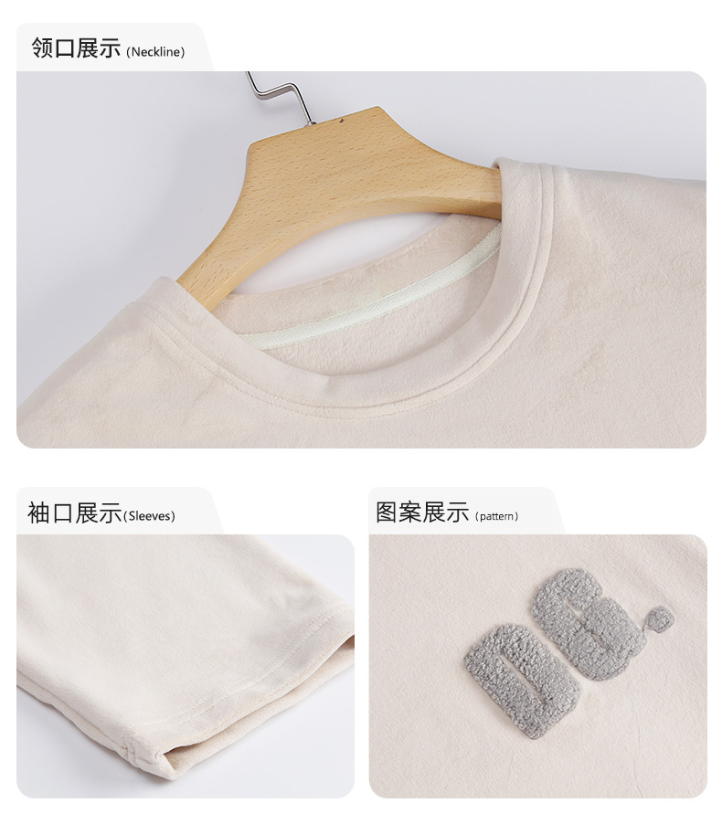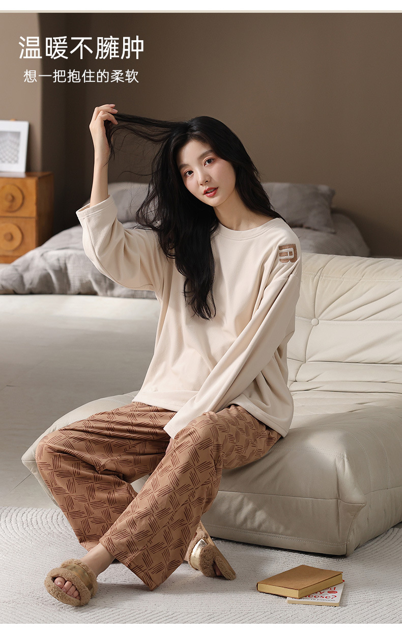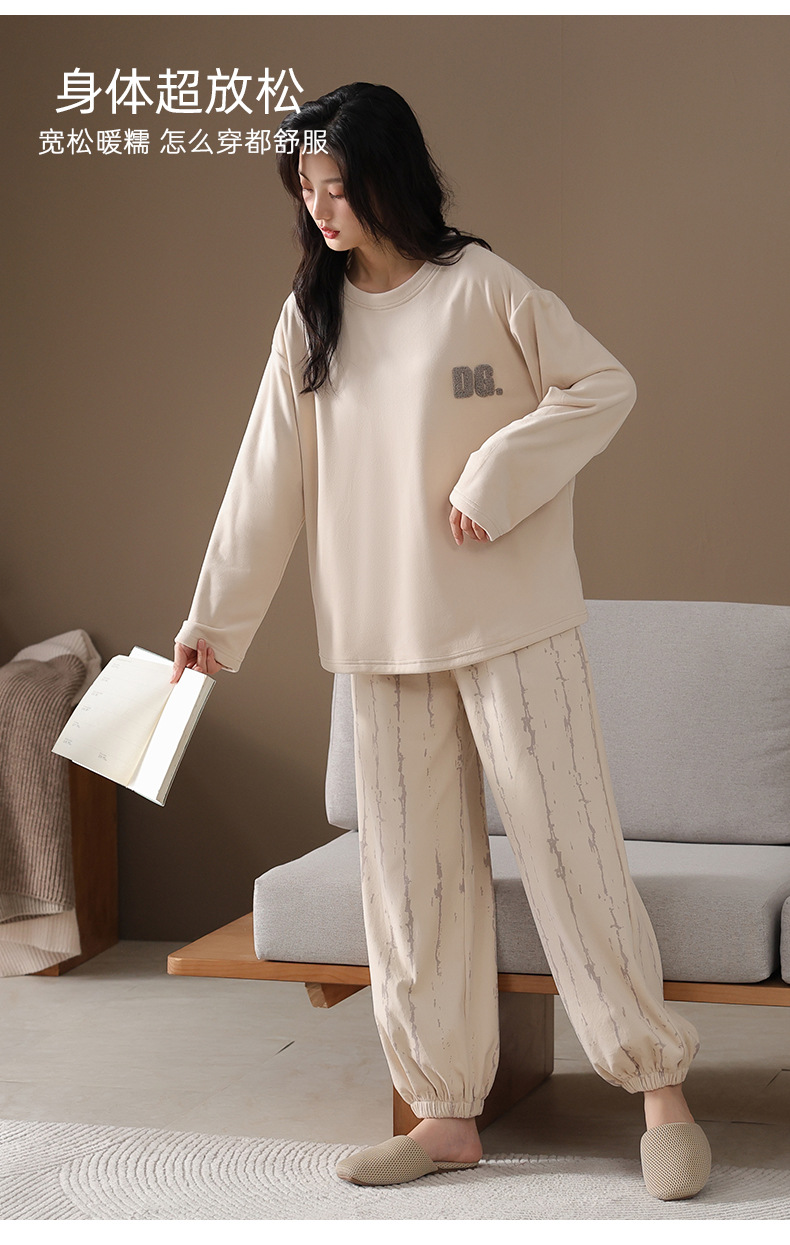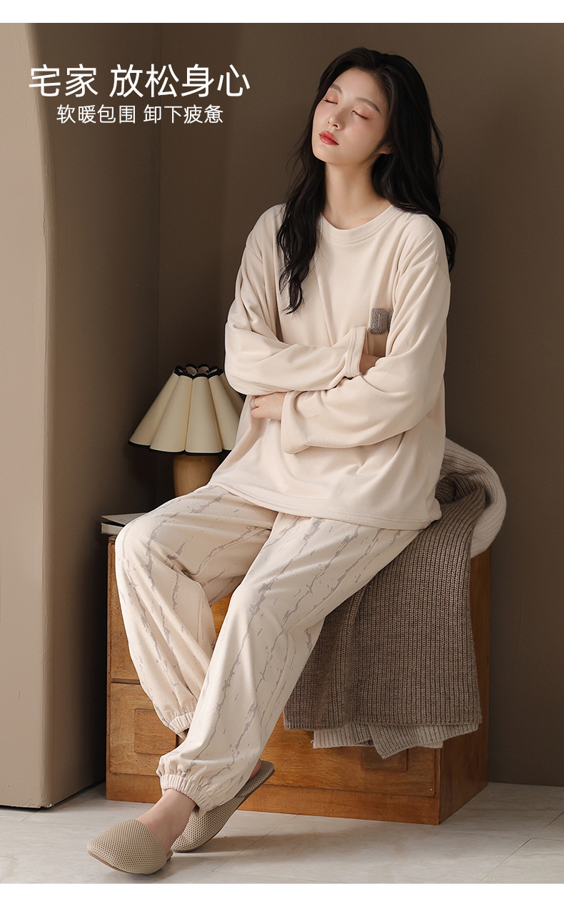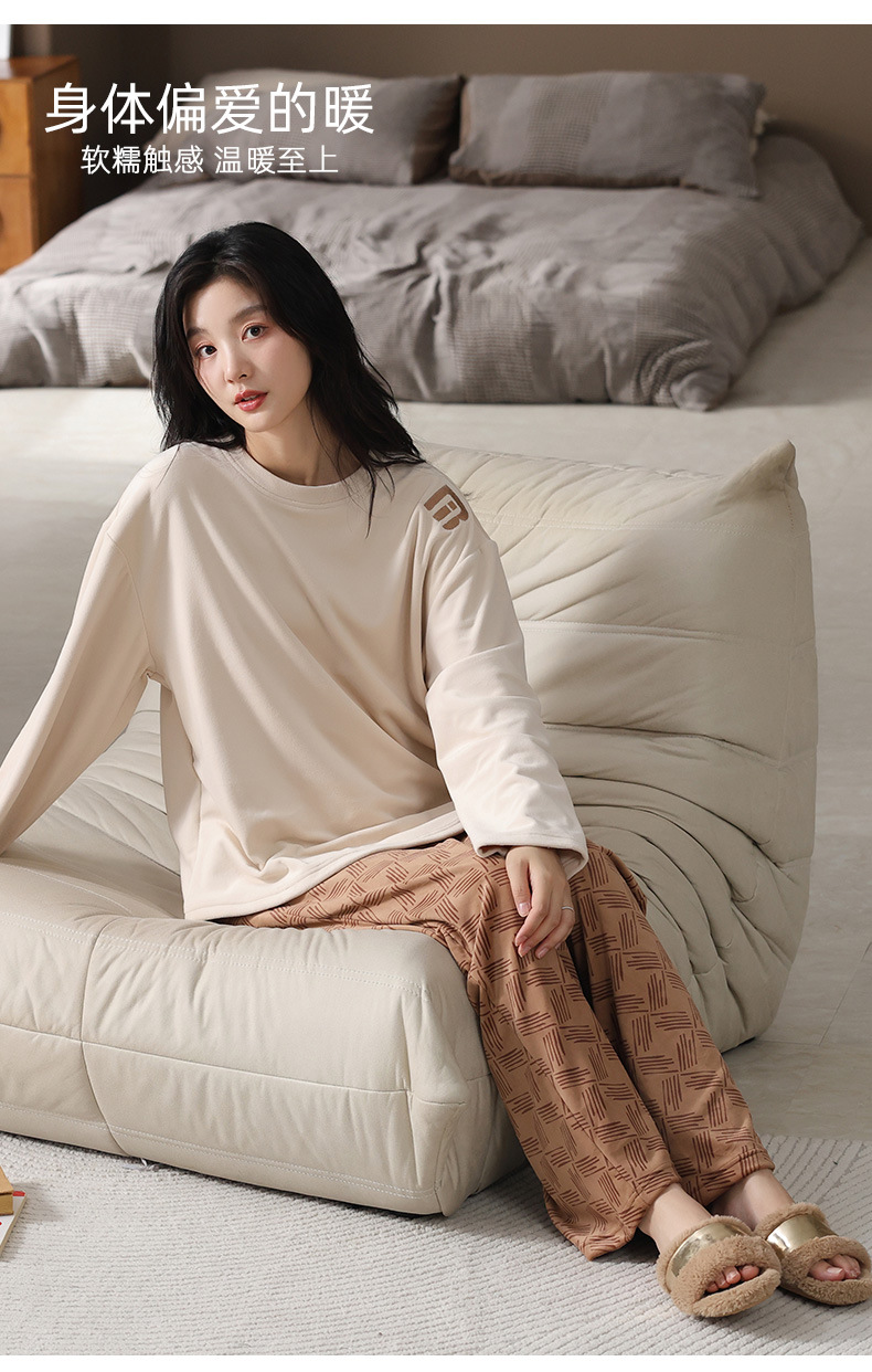 女性のパジャマの新型の海島の絨毛の丸首は頭の純色の大きいサイズをかぶせて厚い加毛の保温の家の服のズボンのスーツをプラスします。