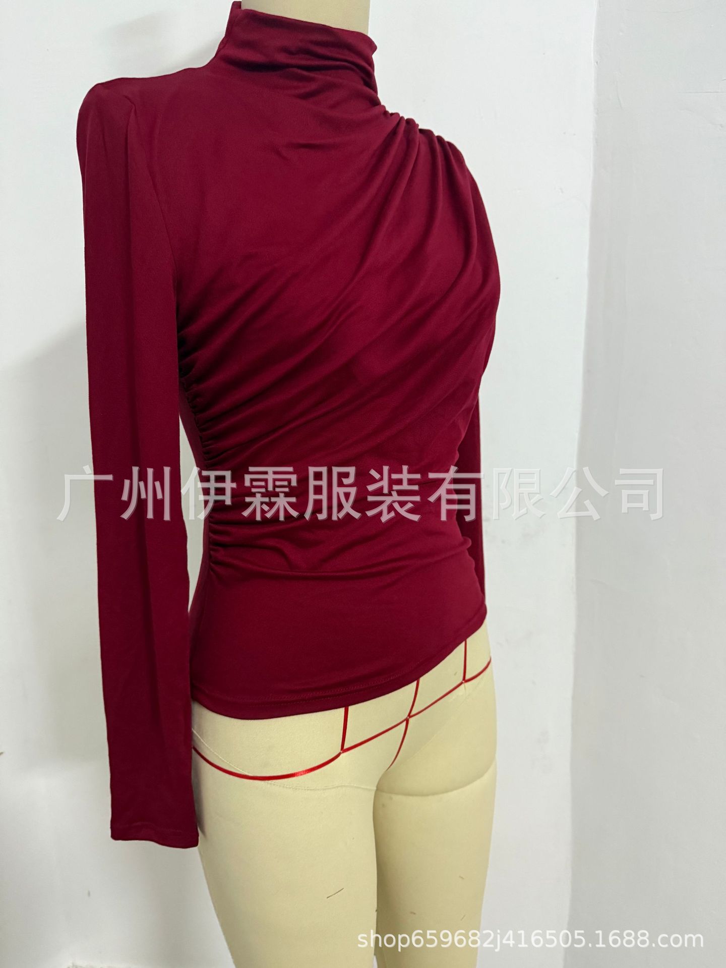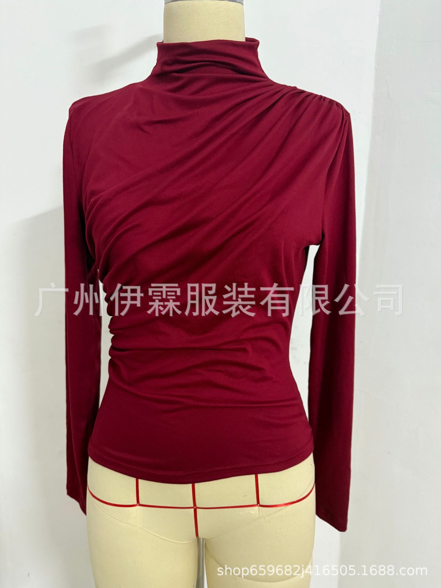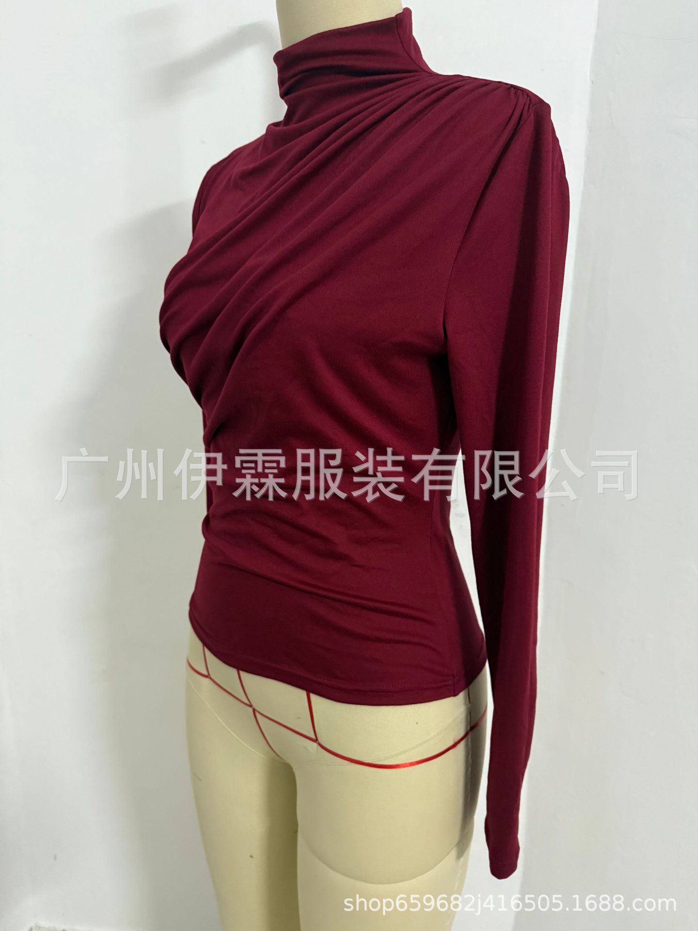 2024秋冬欧米国境を越えた女装新商品ファッションカジュアル修身しわ高襟長袖純色上着tシャツ