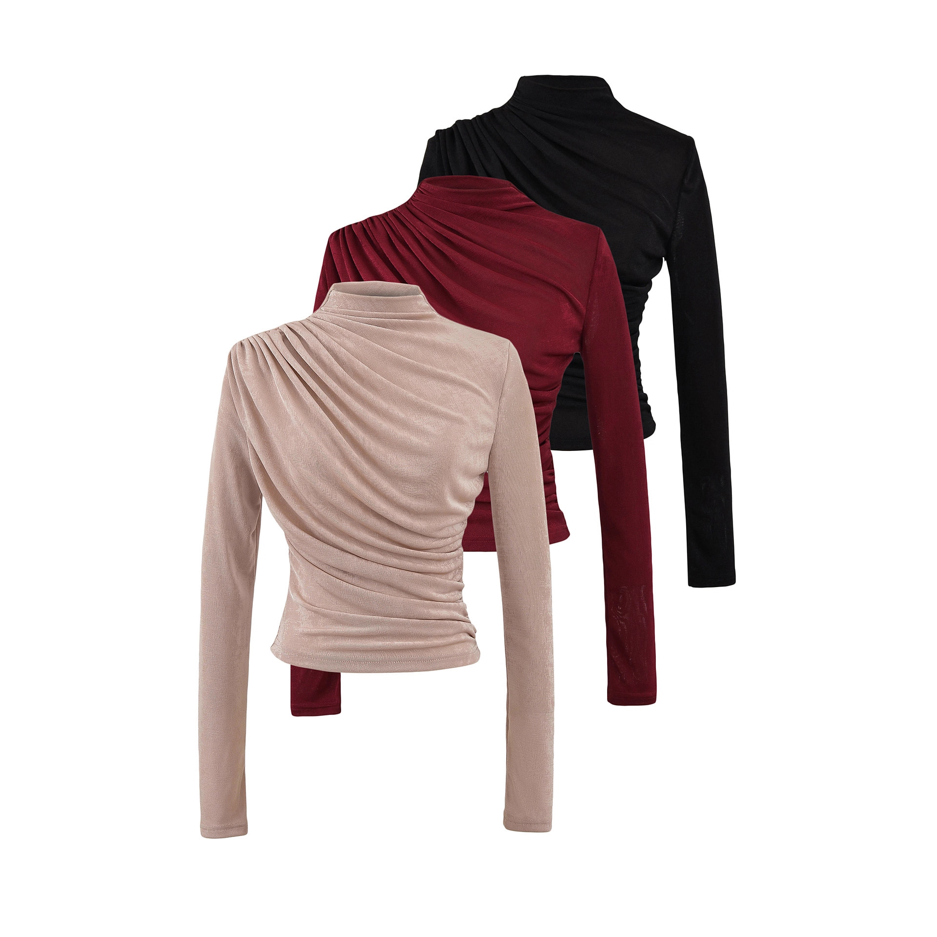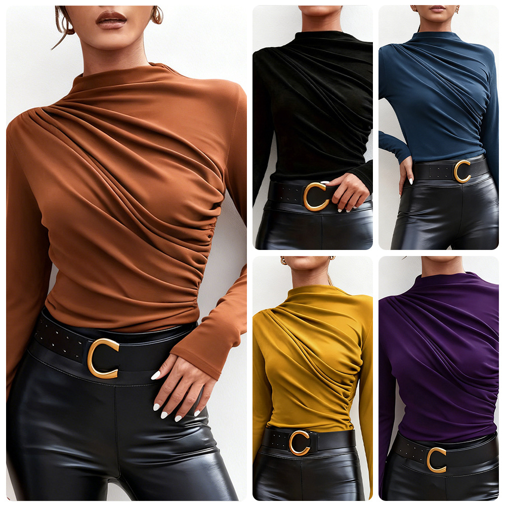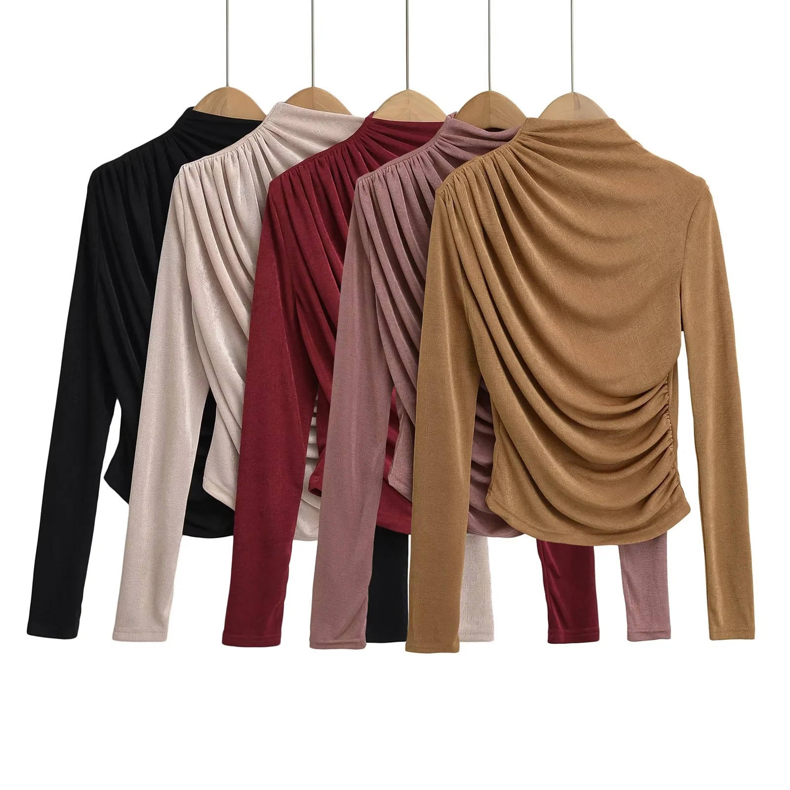 2024秋冬欧米国境を越えた女装新商品ファッションカジュアル修身しわ高襟長袖純色上着tシャツ