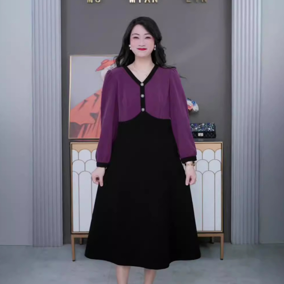 ファッションレトロ気質長袖高級ワンピース2025春秋新作紫修身痩せロングスカート女