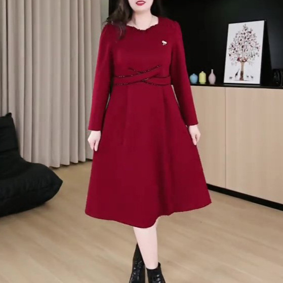 春の新型クリスマスの赤い経典の軽豪華な修身はやせている大きいサイズのワンピースの中年のお母さんの婦人服を現します。