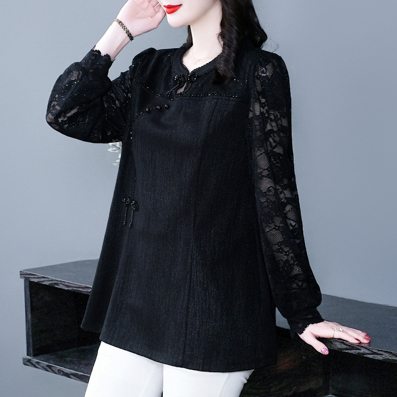 2025秋冬新款新中式盘扣气质长袖蕾丝复古立领衬衫上衣大码女装