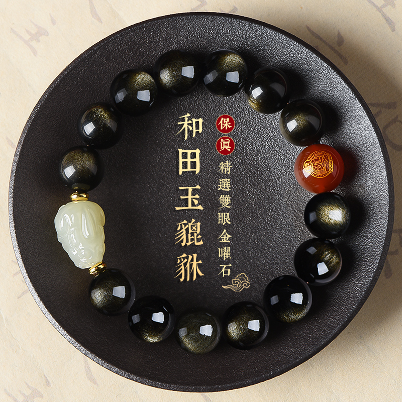 和田玉手串女男転運珠黒曜石金曜石仏珠ブレスレット彼氏本命年プレゼント