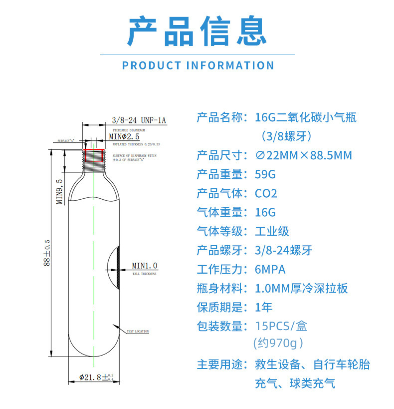 16gタイヤ加気専用二酸化炭素瓶小型ボンベco2炭素鋼3/8ねじ小型ボンベ