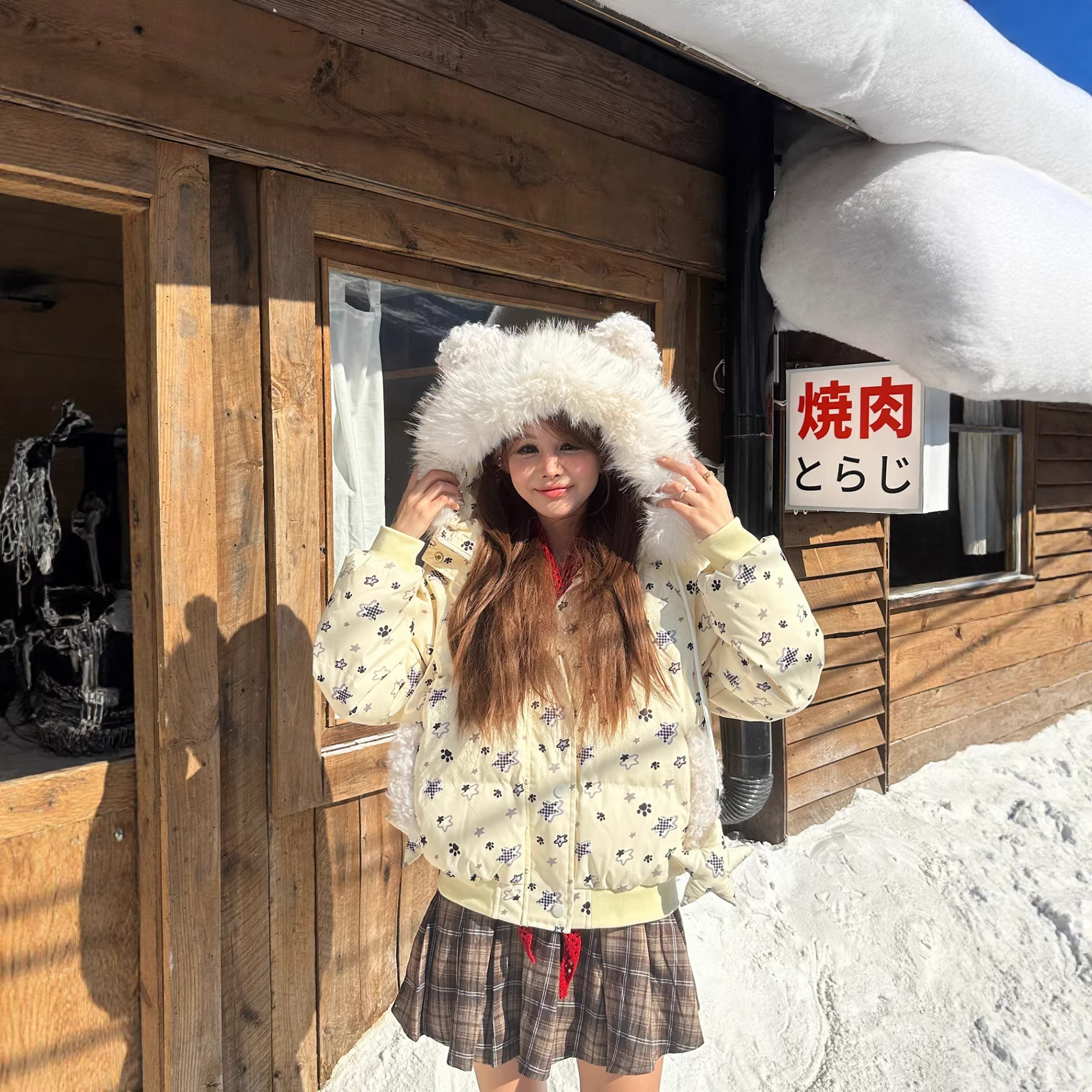 美式复古雪花兔子印花毛领连帽棉服女冬季新款百搭保暖面包服外套