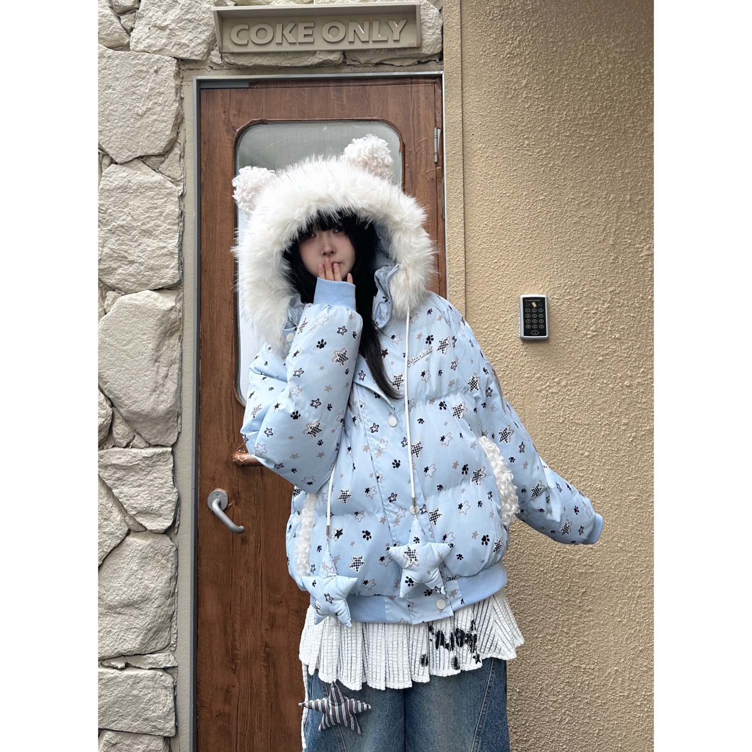 可爱猫耳毛领复古星星连帽棉服女冬季宽松休闲保暖棉衣外套