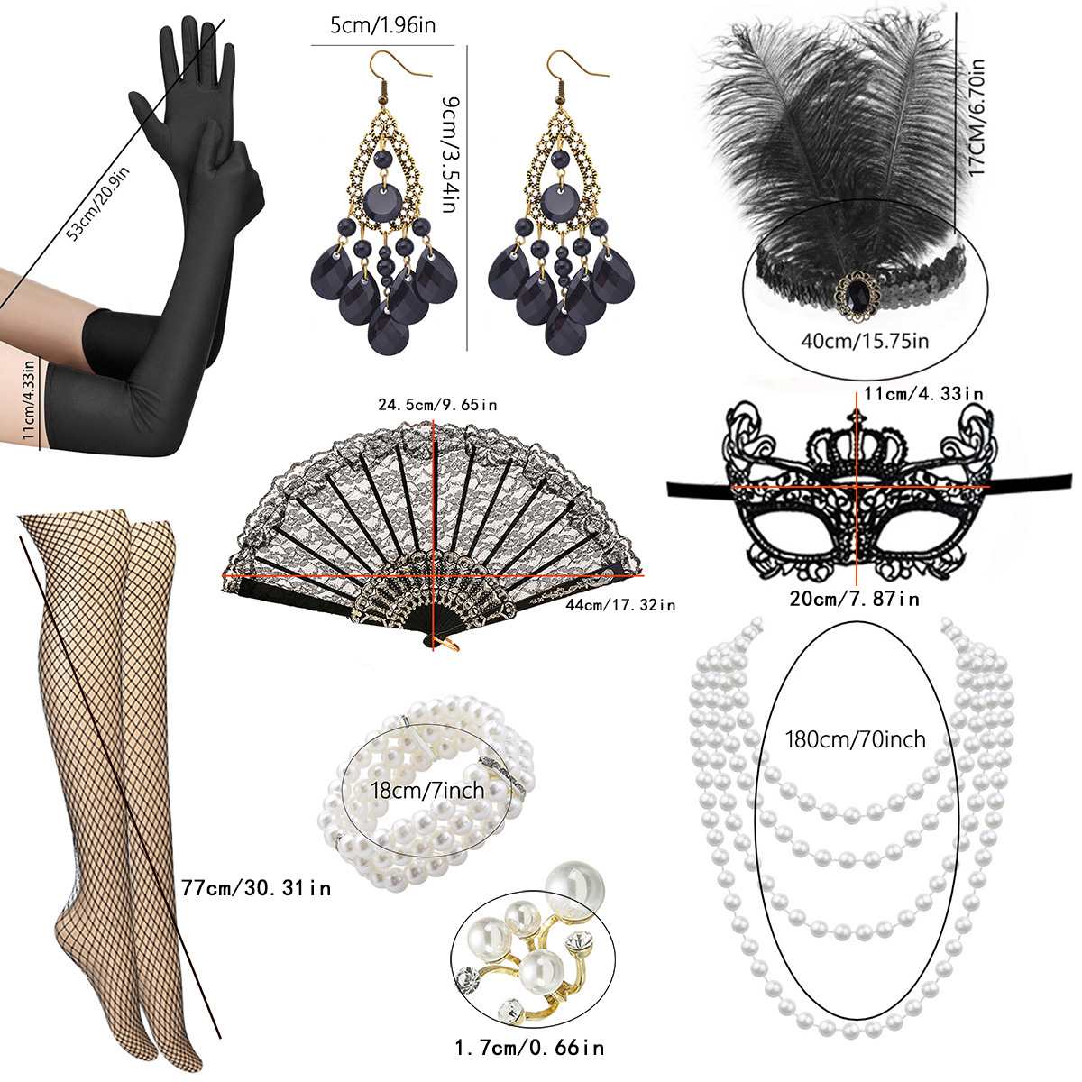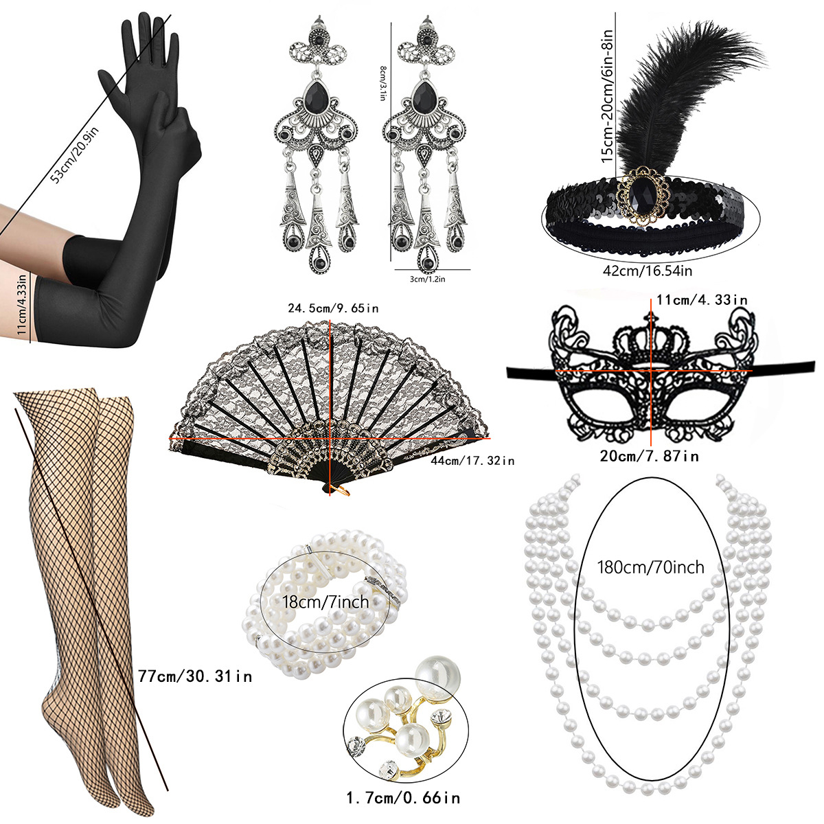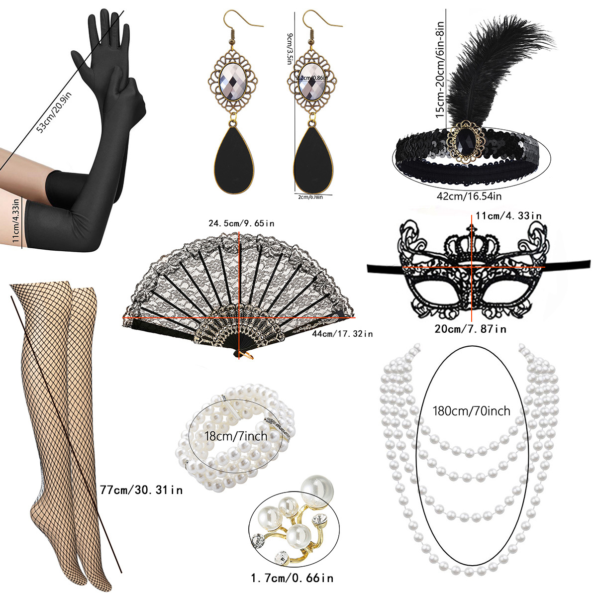 产品名称:1920化妆舞会派对羽毛头带项链耳环戒指扇子渔网丝袜面具套装现货
