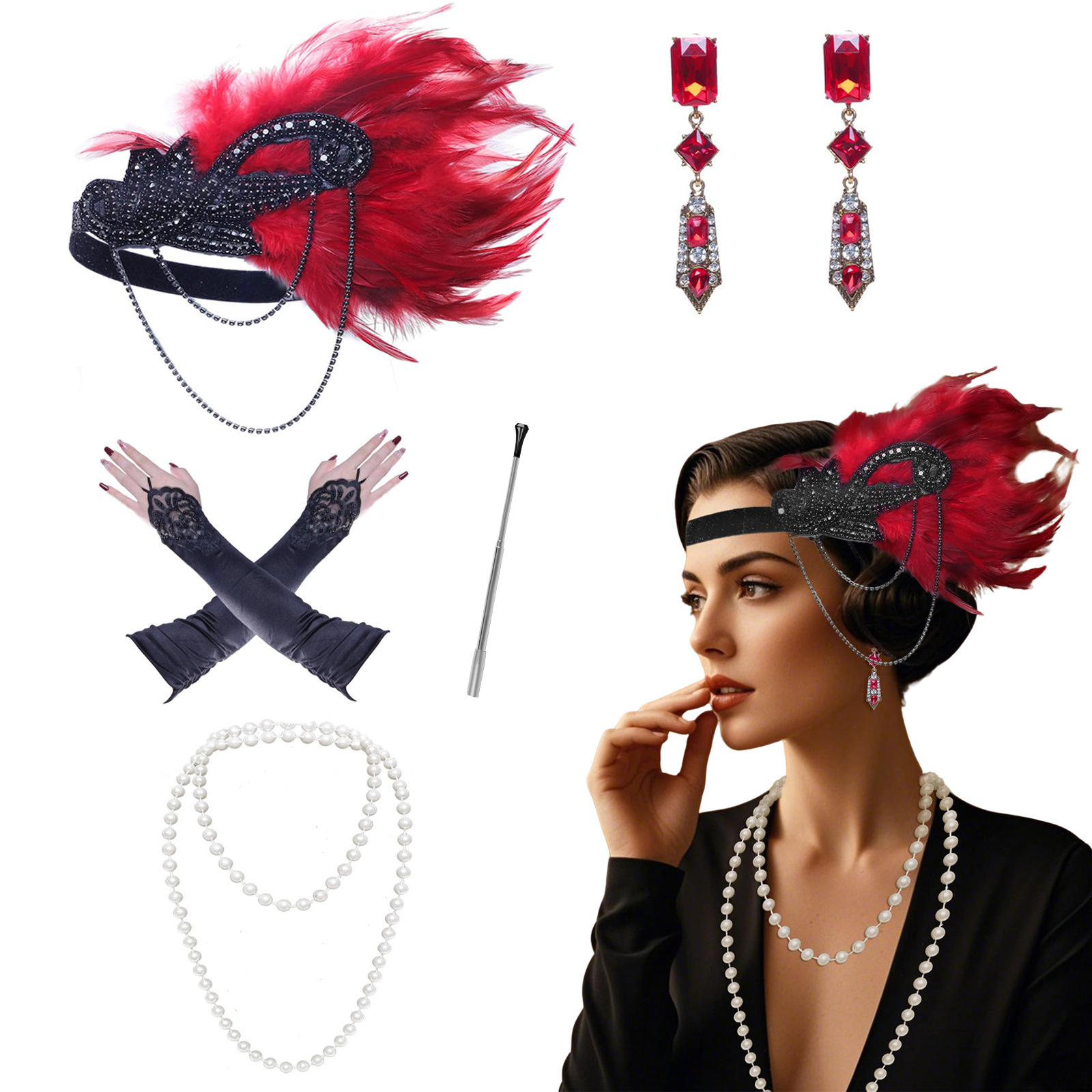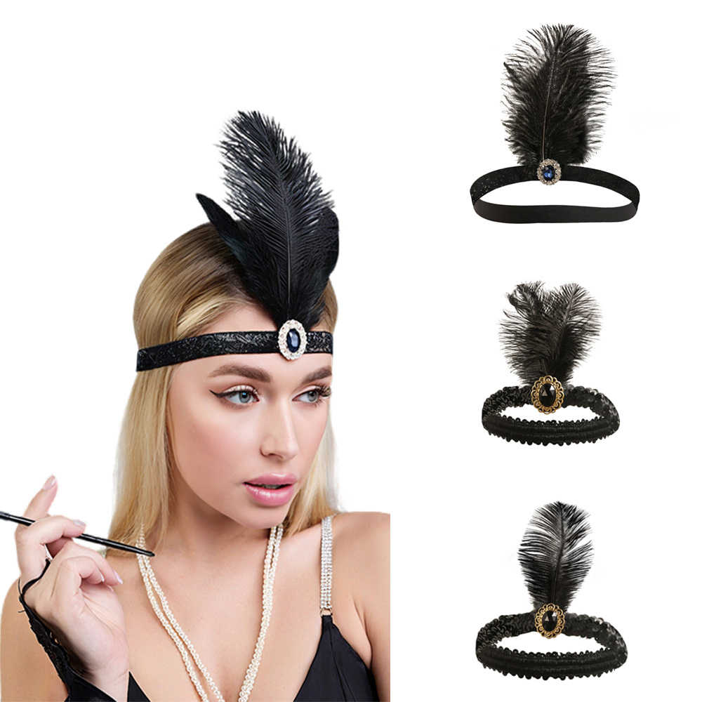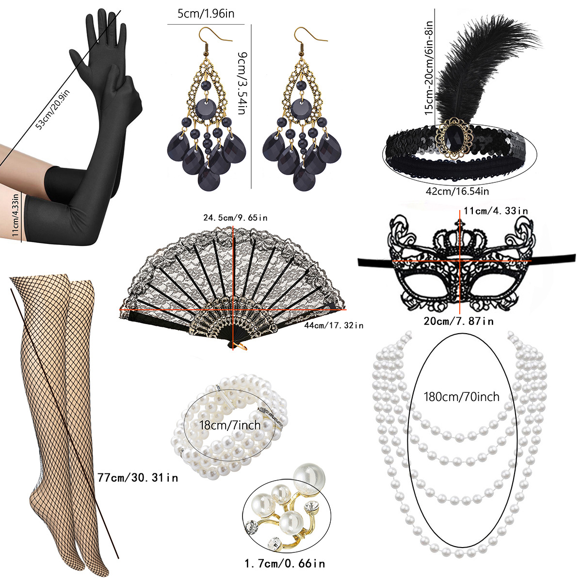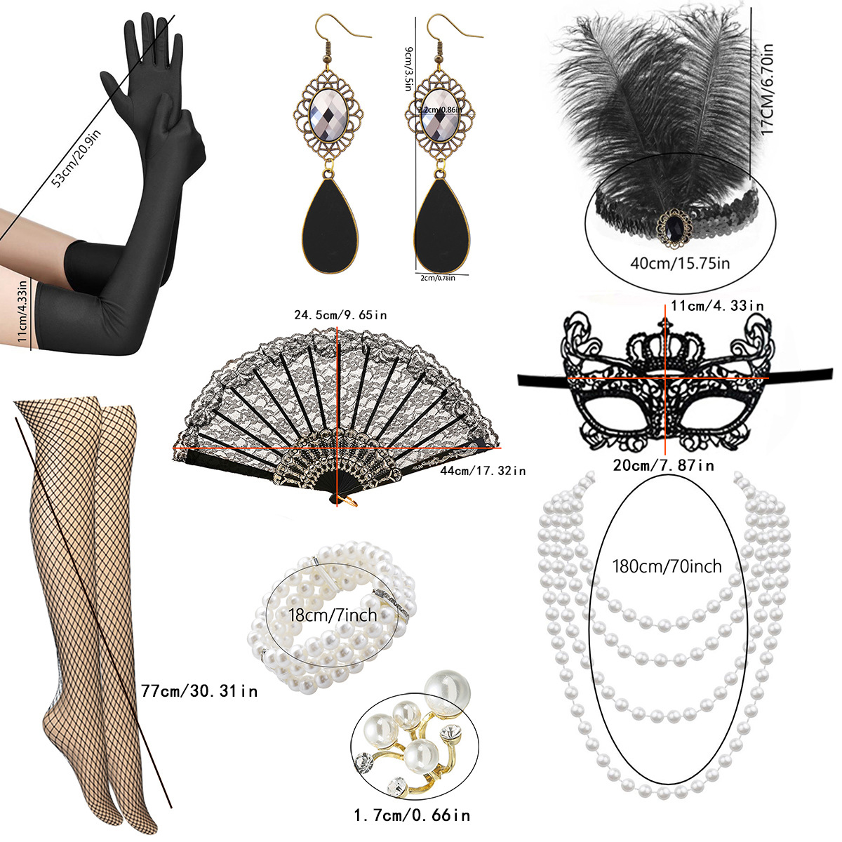 产品名称:1920化妆舞会派对羽毛头带项链耳环戒指扇子渔网丝袜面具套装现货