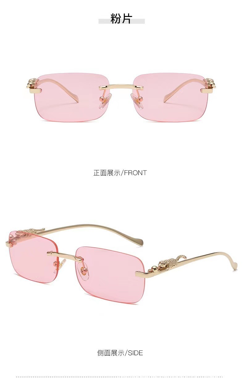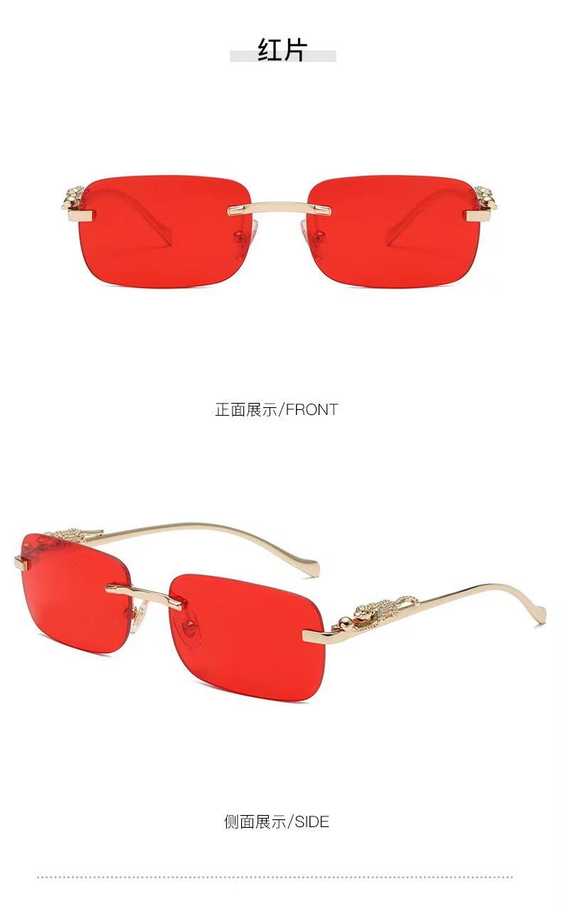 男性と女性のための新しいフレームレススクエアサングラス、レトロなチーター装飾サングラス、クロスボーダーヒョウヘッドメタルサングラス