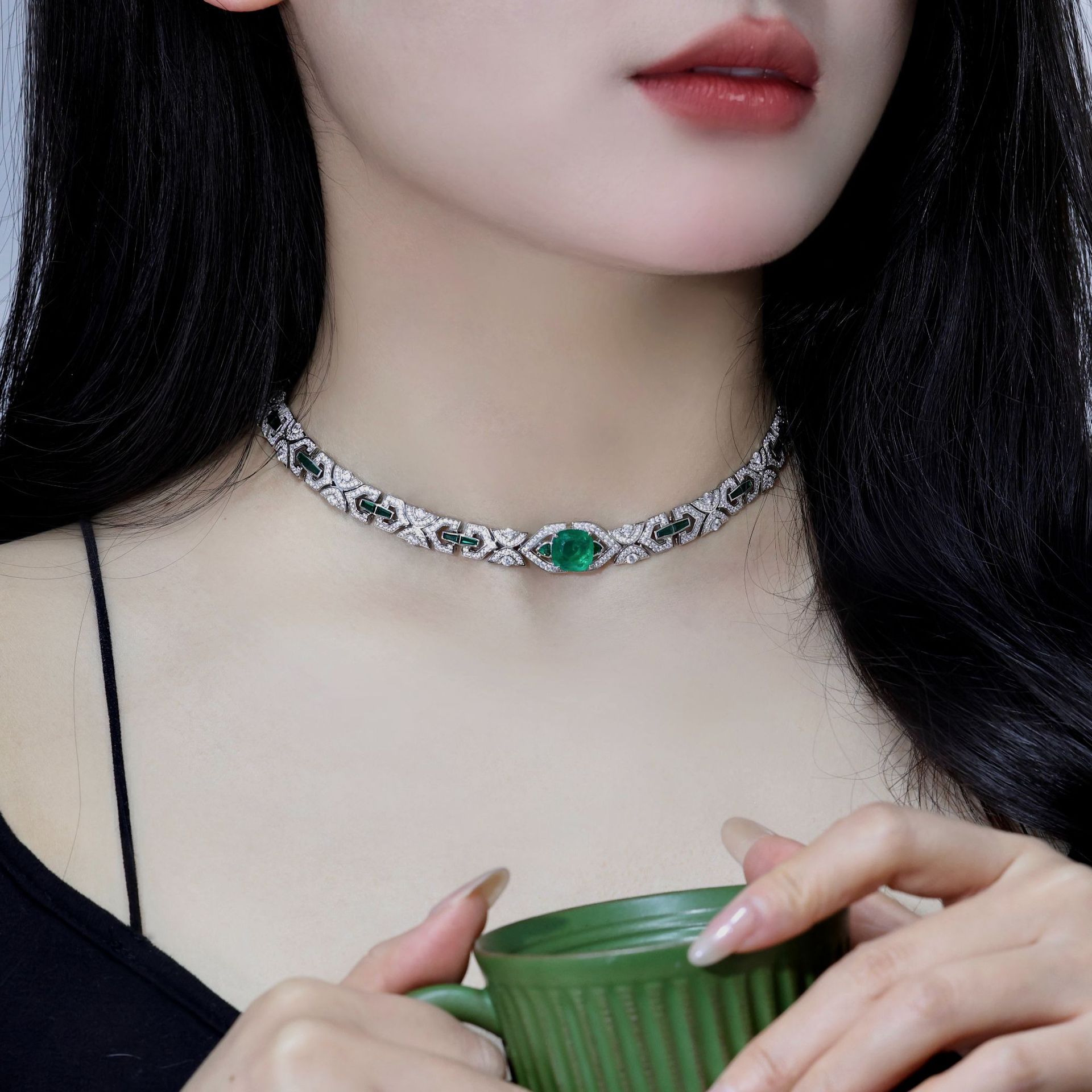 ヨーロッパとアメリカの誇張されたヘビーデューティエメラルド宝石フルダイヤモンドネックレス文学レトロライト高級レディースジュエリー鎖骨チェーンネックレス