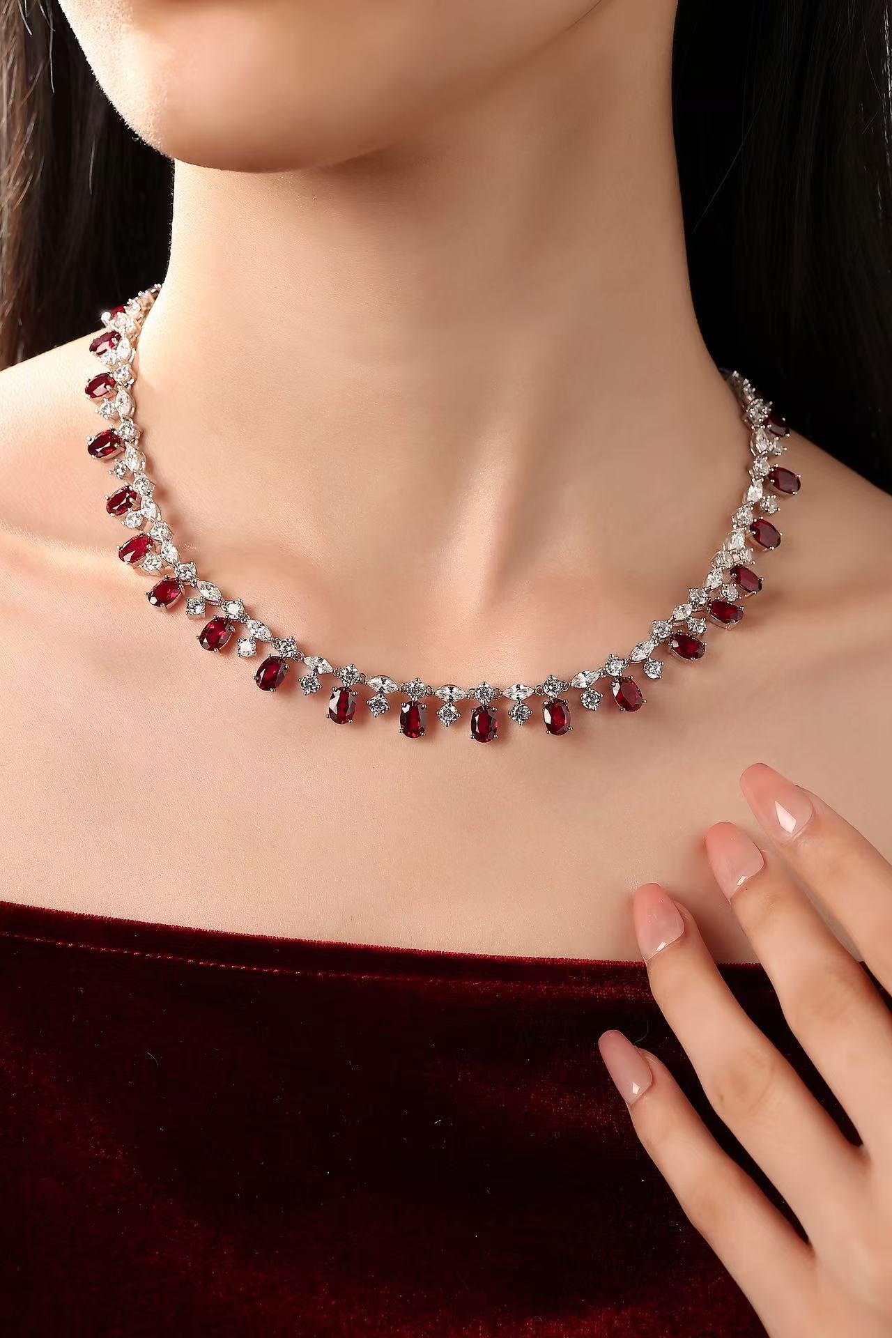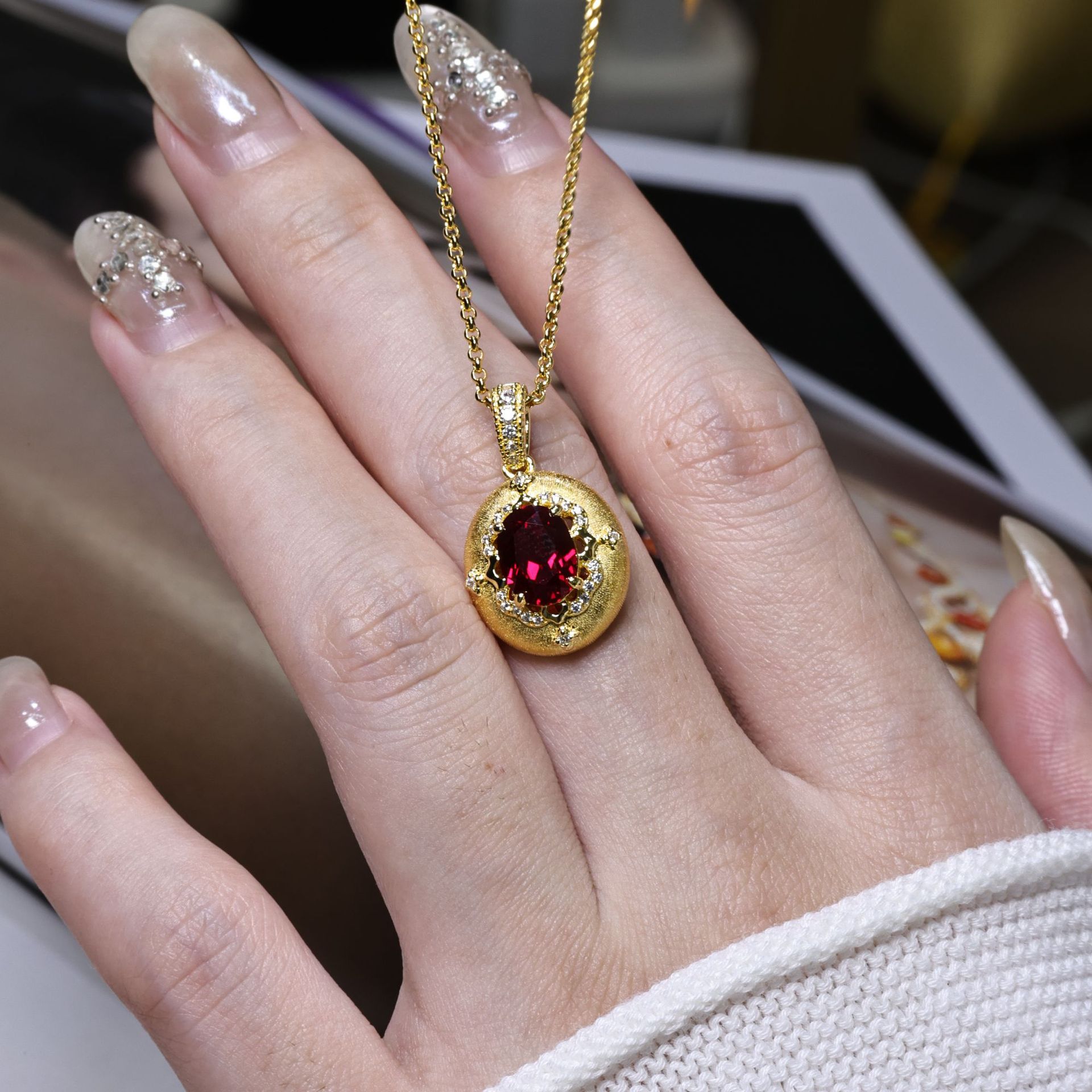 1.5克拉蛋形培育红宝石全手工拉丝S925银厚镀金项链复古宫廷风