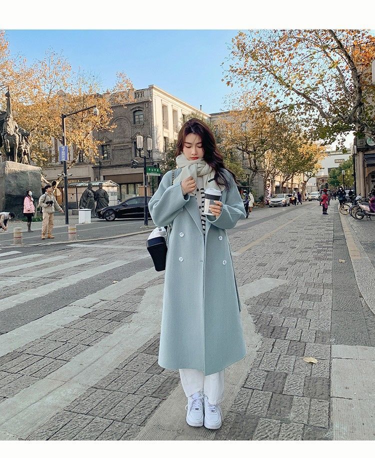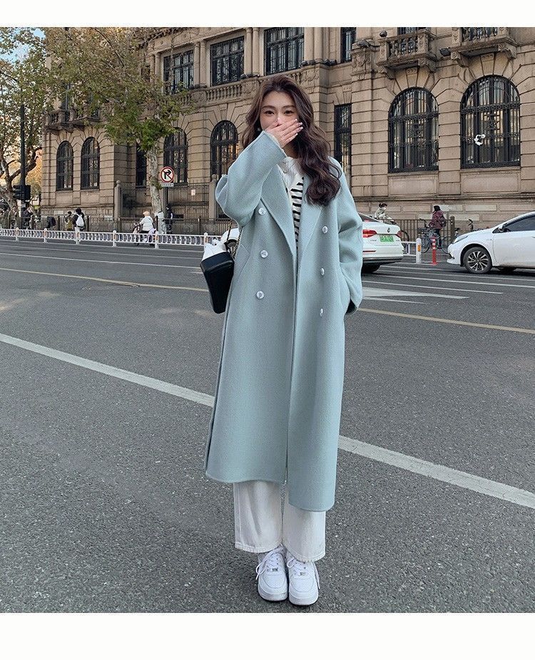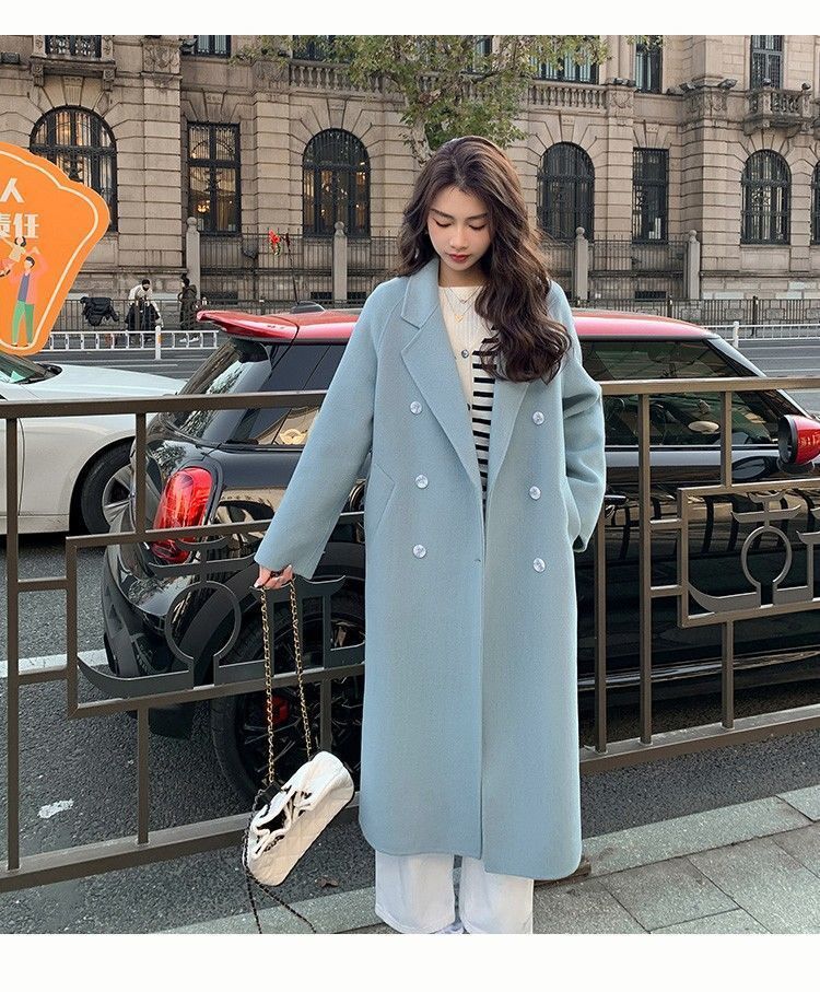 蓝色双面绒呢子大衣女2025年秋冬新款韩版宽松中长款赫本毛呢外套