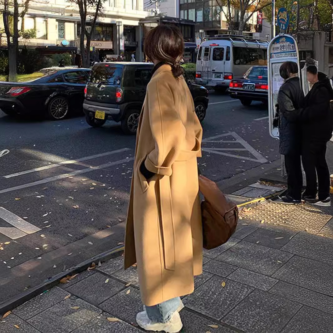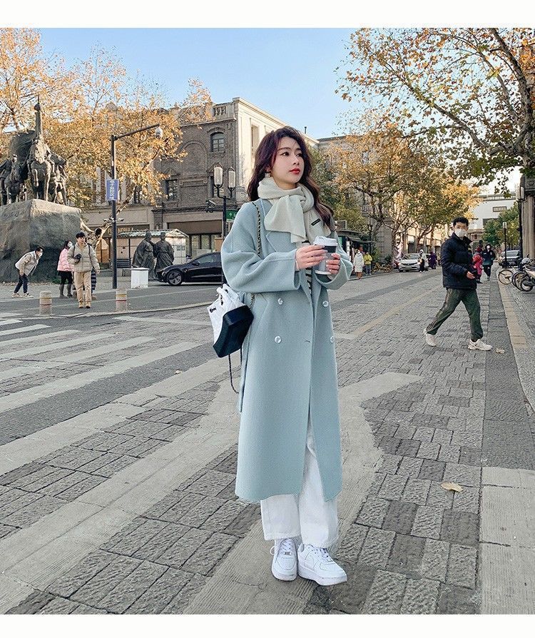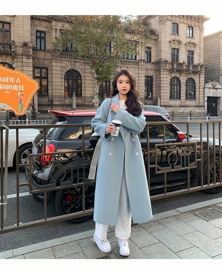 蓝色呢子大衣女2025秋冬季新款韩版宽松加厚中长款系带毛呢外套女