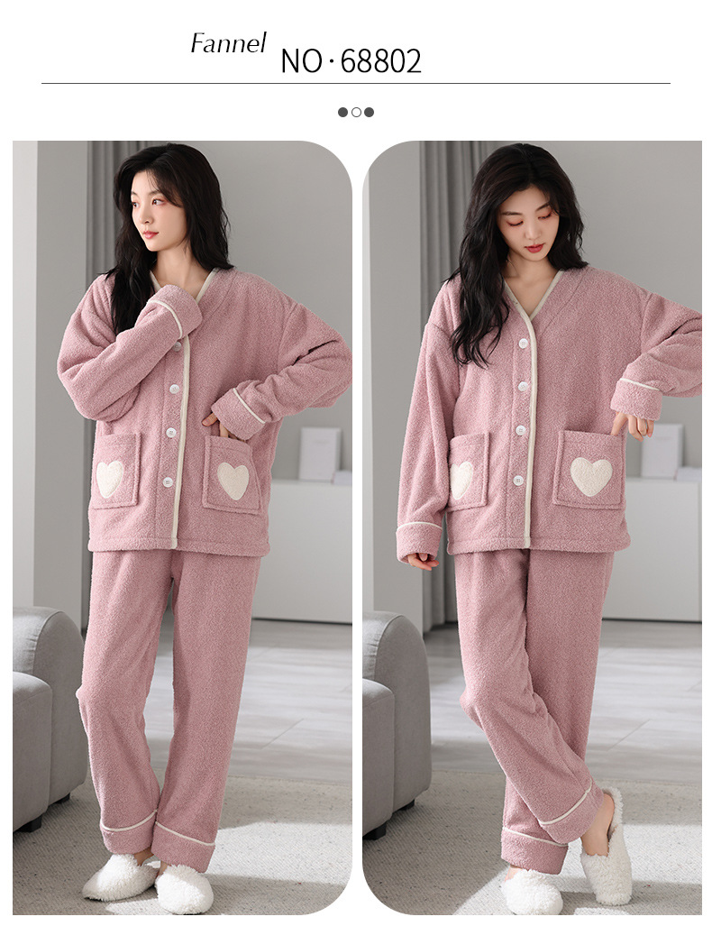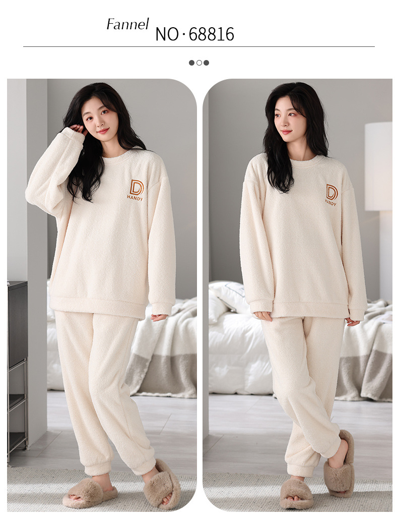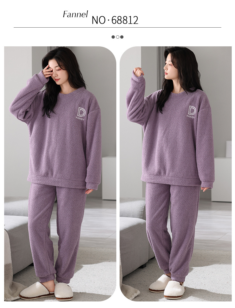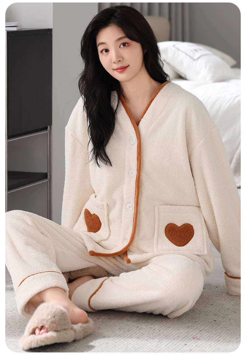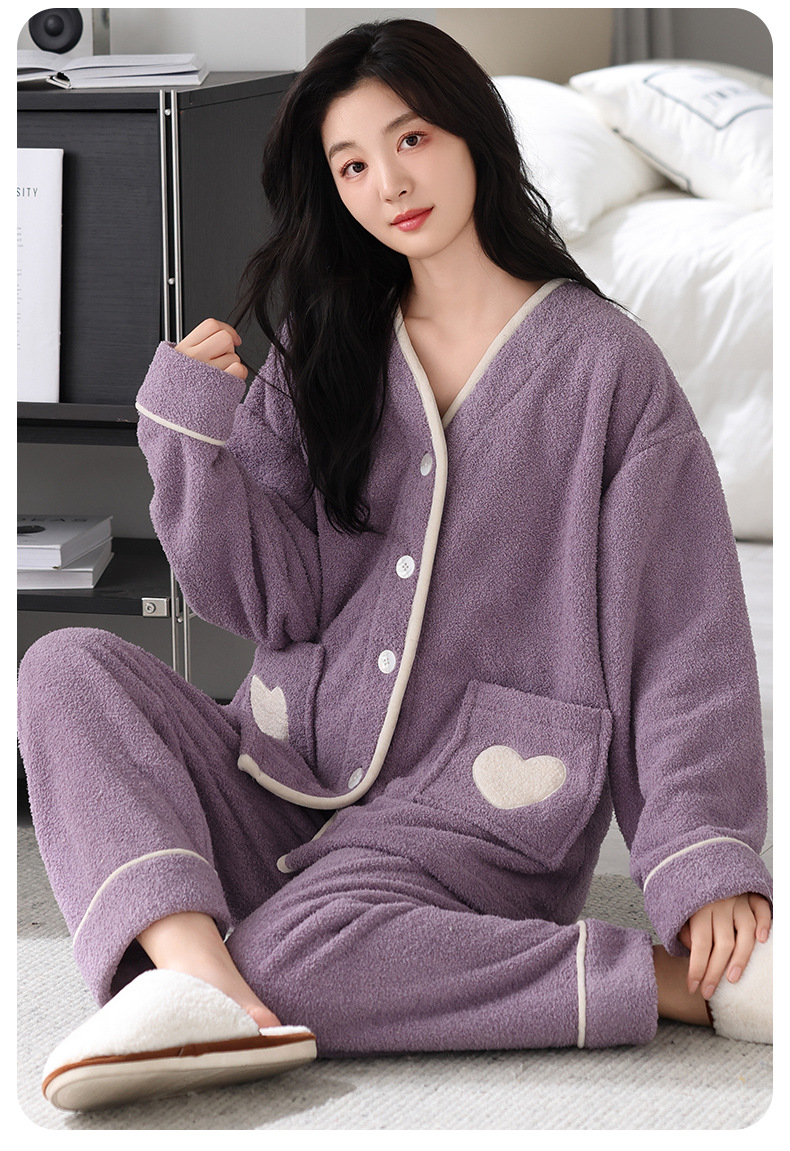 2024新韓版高級純色パジャマ女性冬金とベルベットの厚いニットの家庭服セットは外で着ることができる