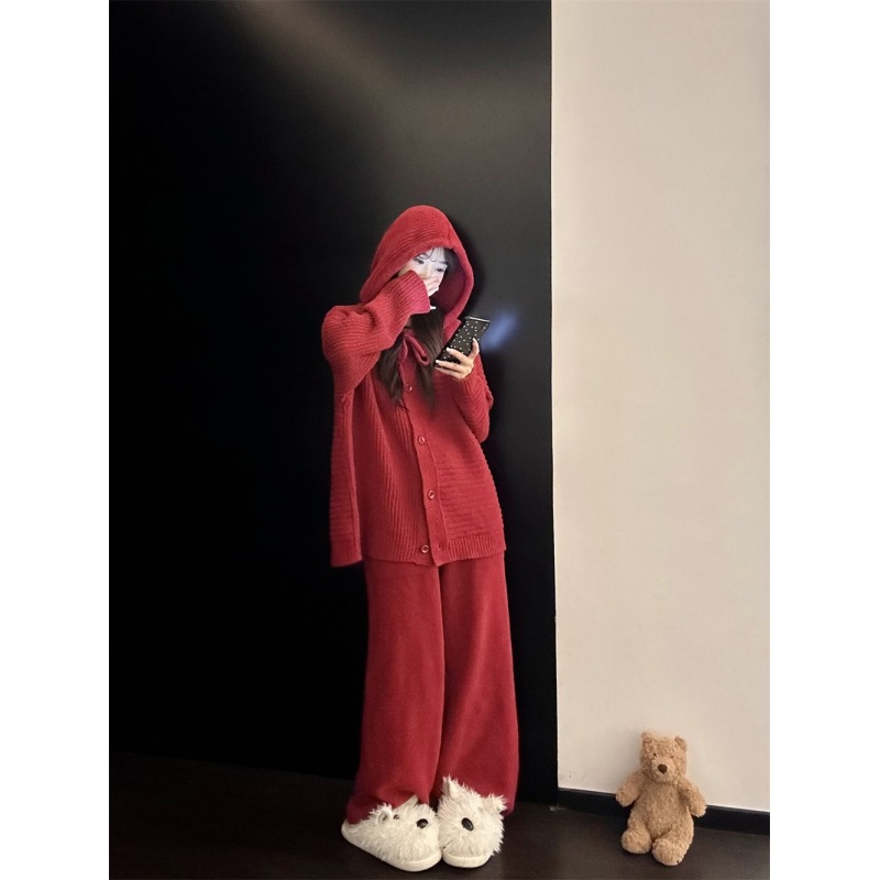 韩系慵懒复古红连帽针织半边绒睡衣女秋冬新款加绒加厚家居服套装