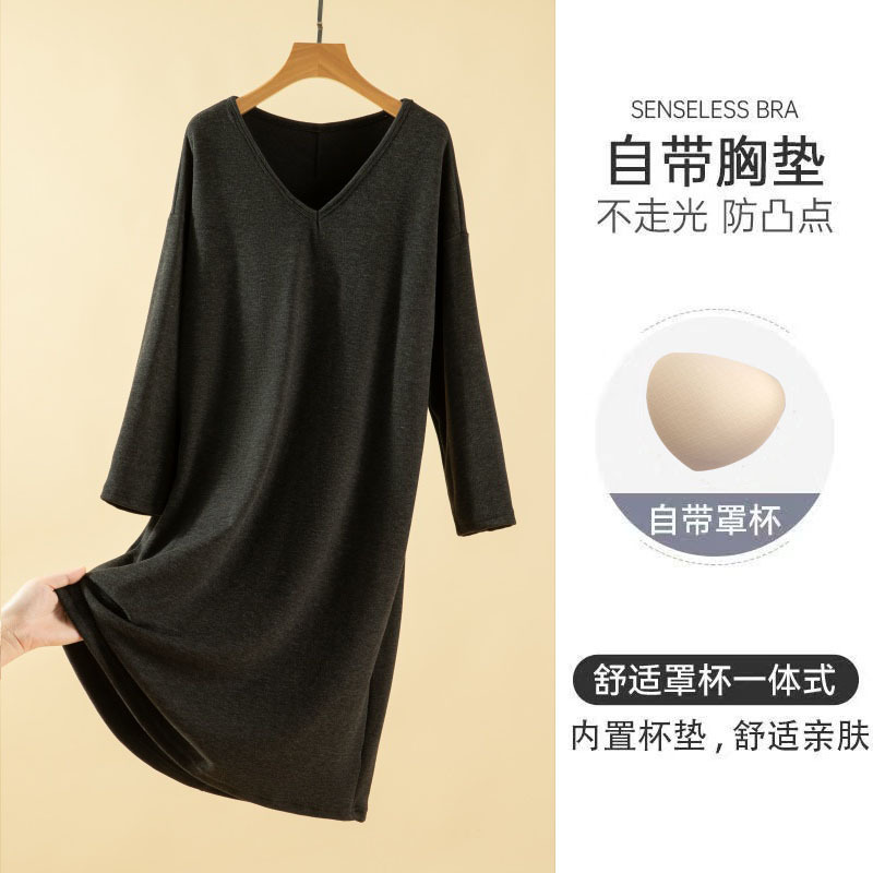 秋冬新款带胸垫V领睡裙长袖连衣裙德绒保暖宽松大码休闲家居服女
