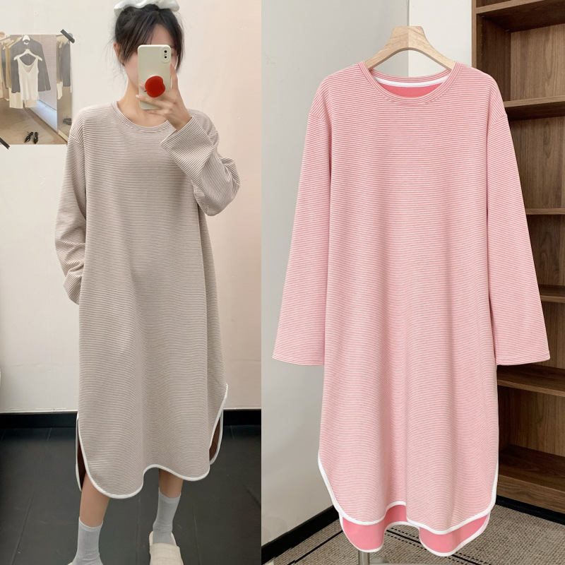 羊毛德绒条纹睡裙女秋冬加绒保暖宽松显瘦长袖睡衣家居服外穿长裙