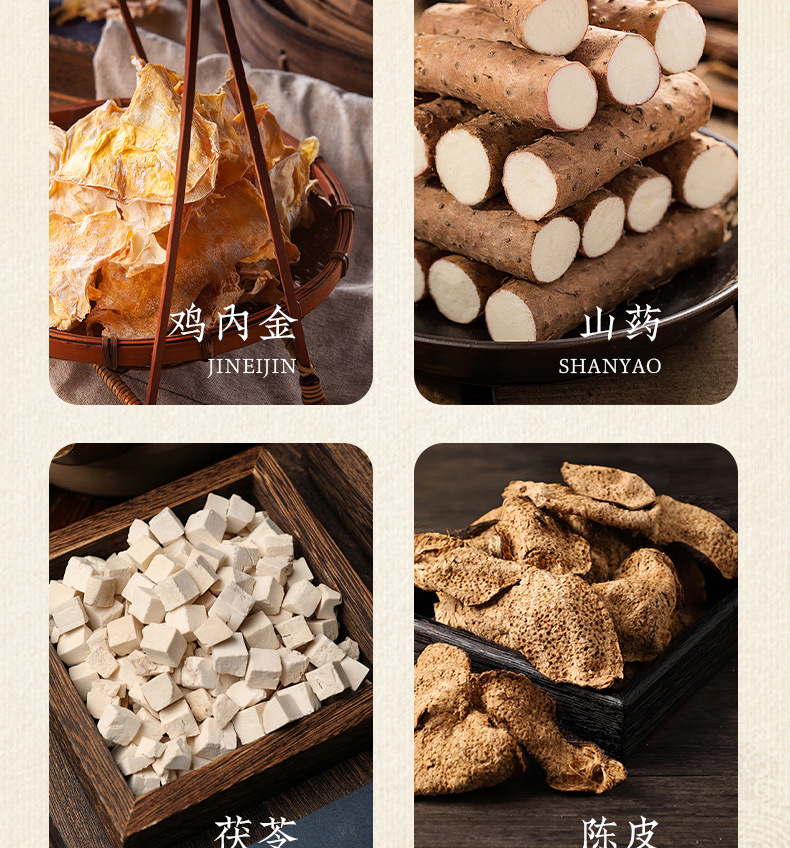 鶏内金六物サンザシ丸山薬茯苓は独立して食いしん坊を包装します。