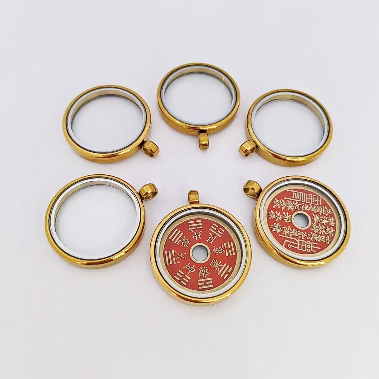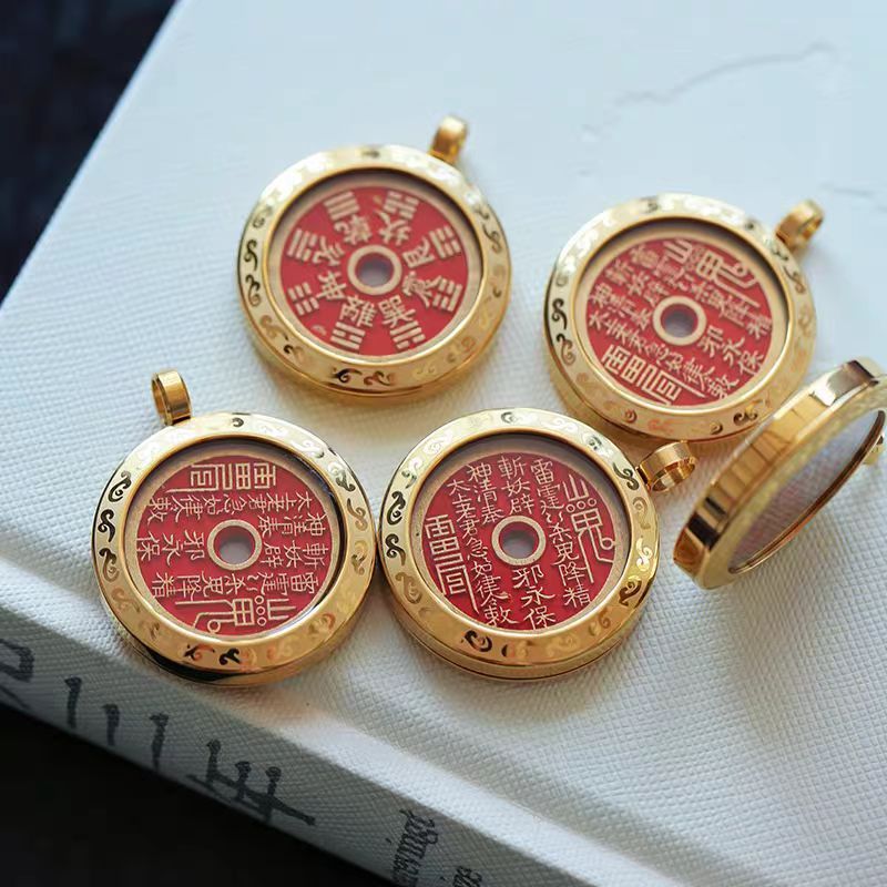 山鬼花钱吊坠钛钢保护壳朱砂吉祥招财祥云嘎乌盒八卦不锈钢铜钱壳
