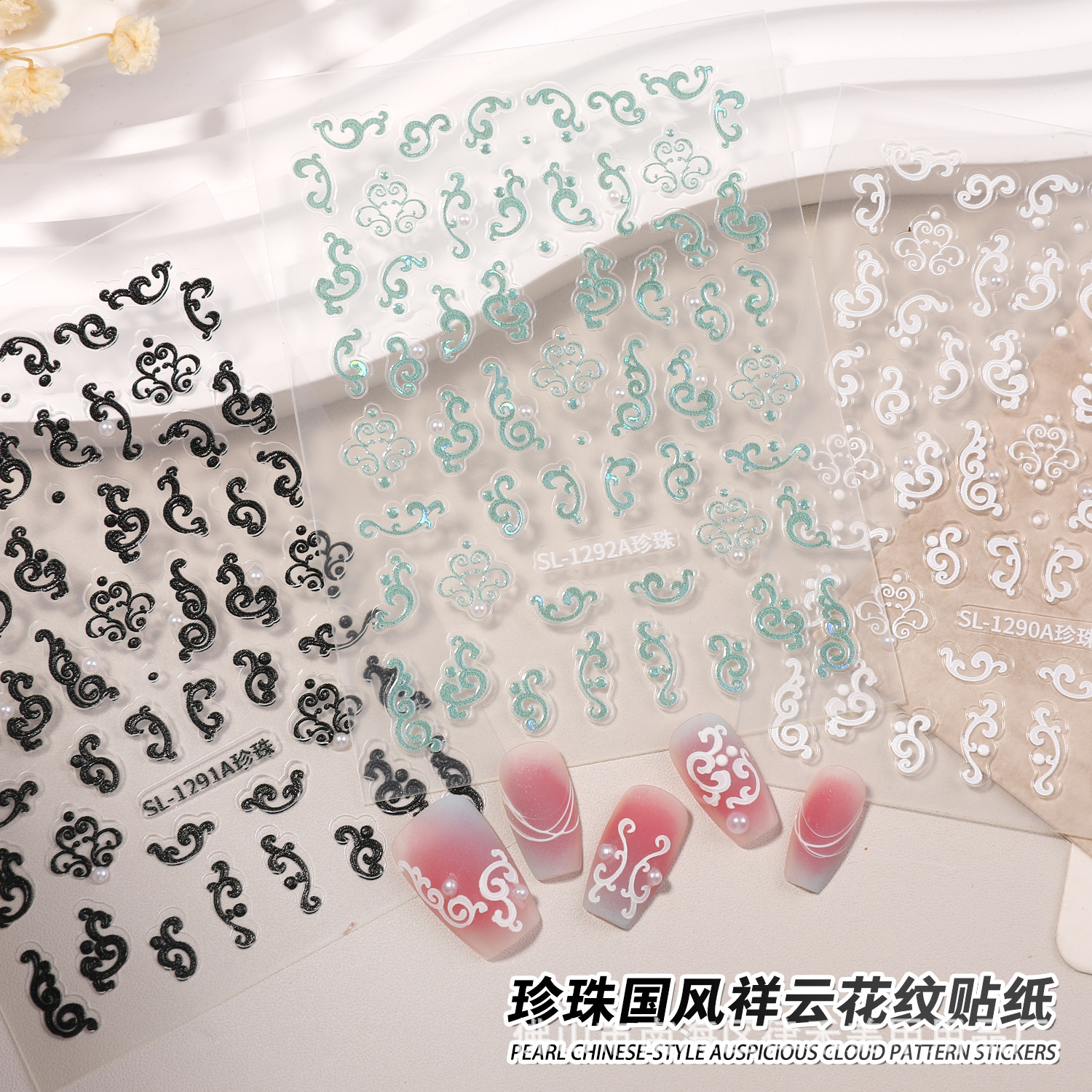 新款轻奢珍珠国风祥云美甲贴纸浮雕镂空百搭显白黑白花纹指甲饰品