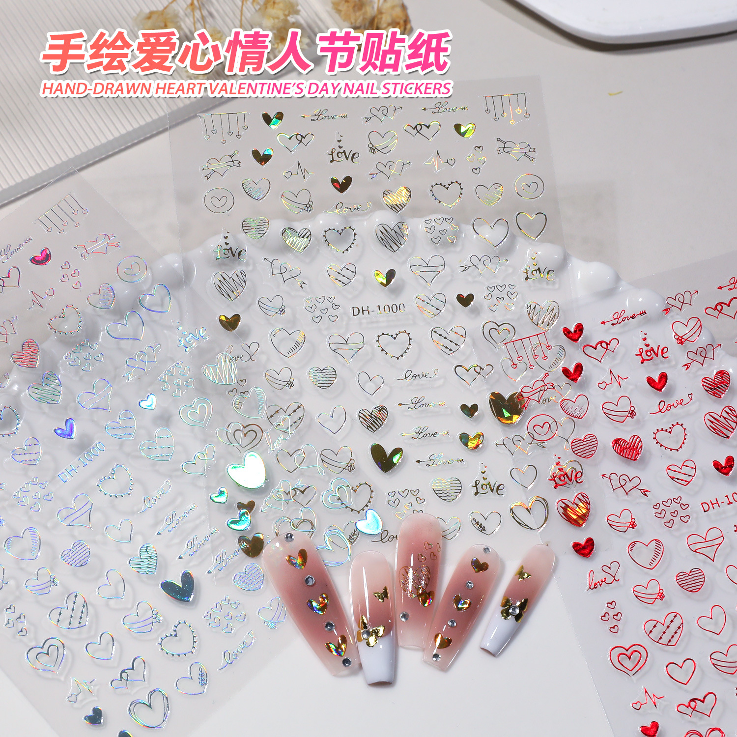 网红爆款镭射情人节爱心美甲贴纸2D烫金幻彩镂空爱心指甲贴带背胶