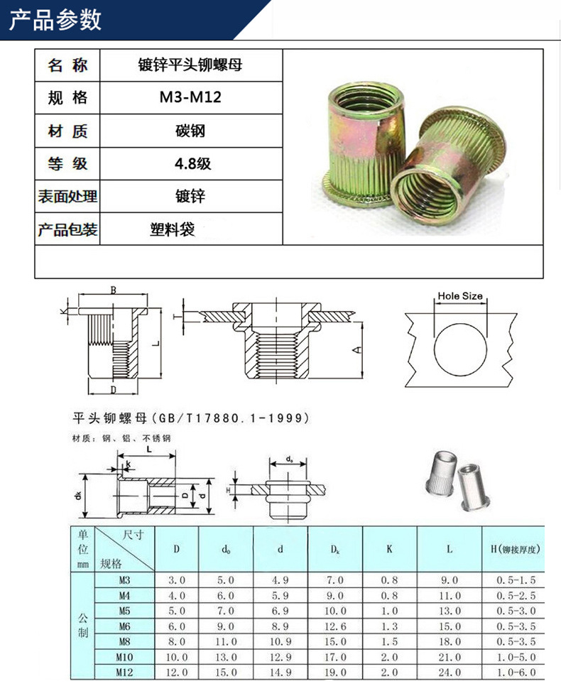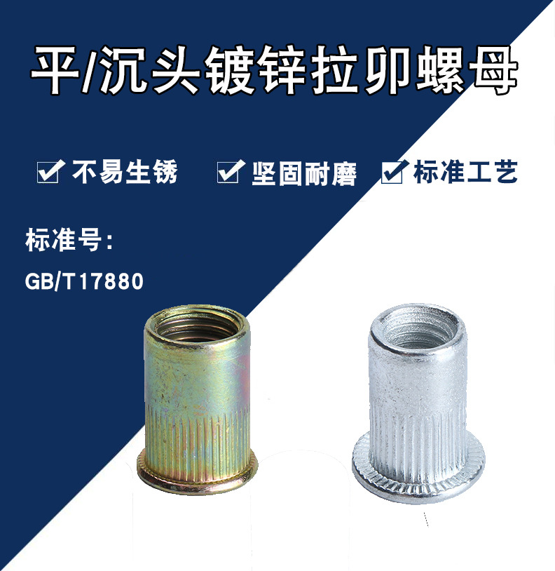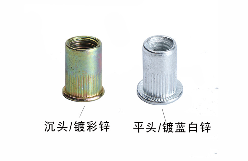 此拉铆螺母分平头跟小沉头,表面处理有铁镀蓝白锌跟镀彩锌,具体价格规格数量请咨询客服,厂家直销,规格齐全,量大价优,大量现货,发货快。