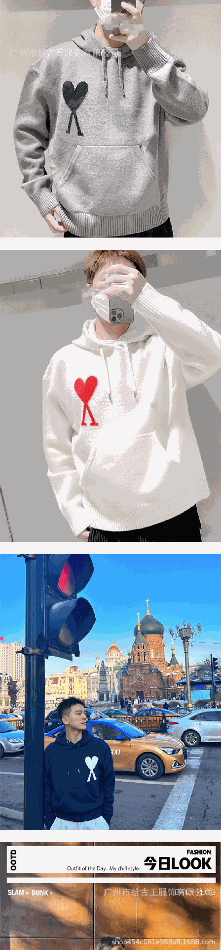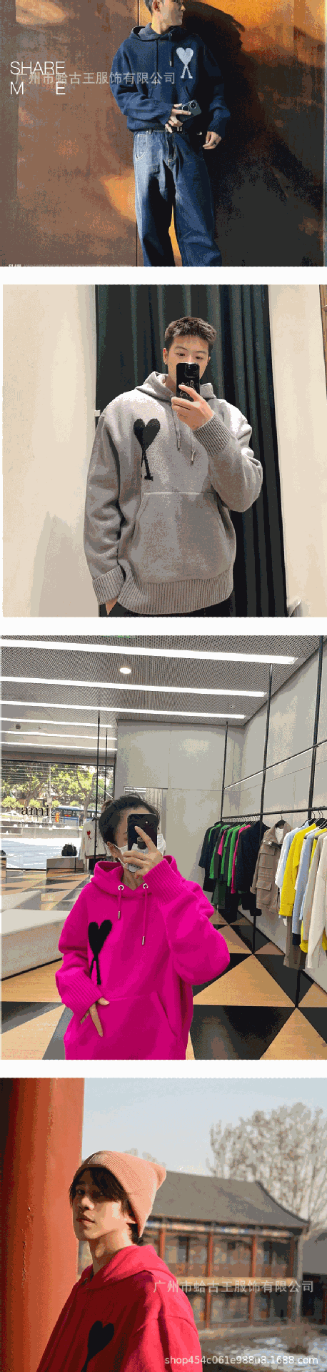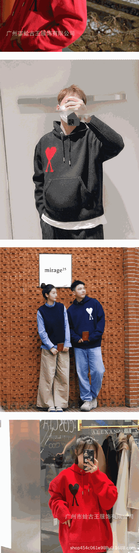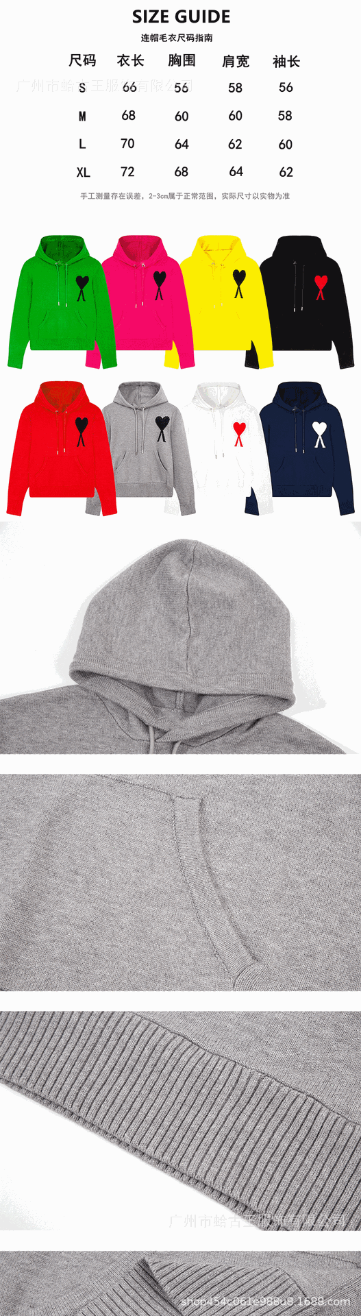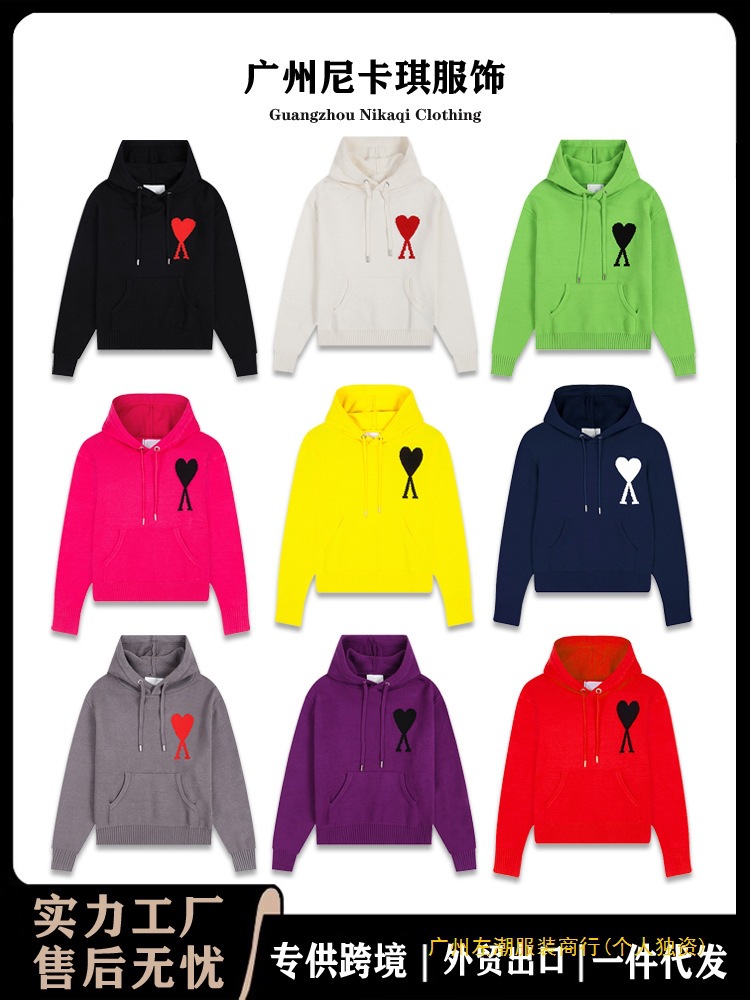 跨境!ami连帽毛衣爱心刺绣情侣长袖卫衣宽松男女羊毛帽衫外套ins
