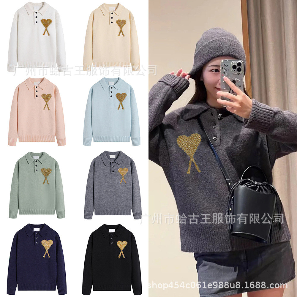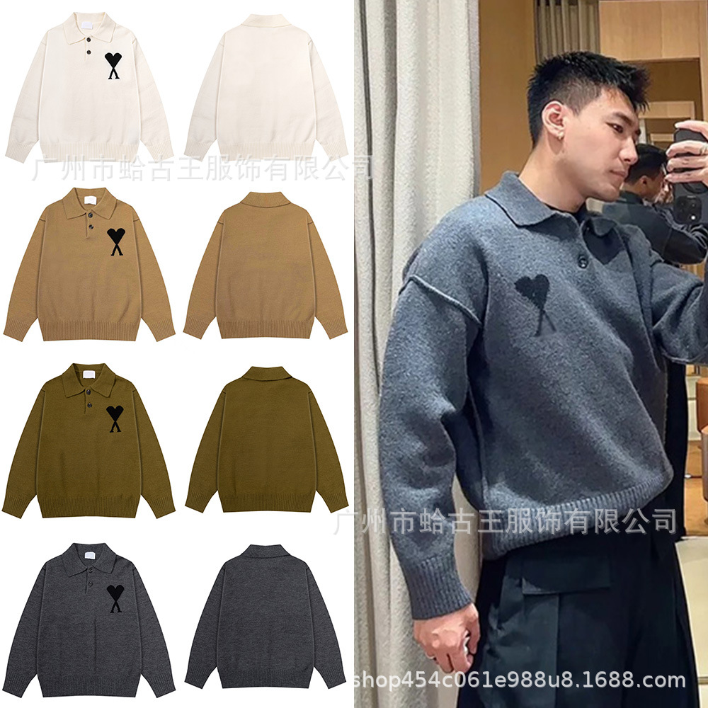AMI CLAMS セーター ラージ ラブ ジャカード ラペル ポロ セーター セーター ルーズ ソフト ワックス 長袖 男女同スタイル