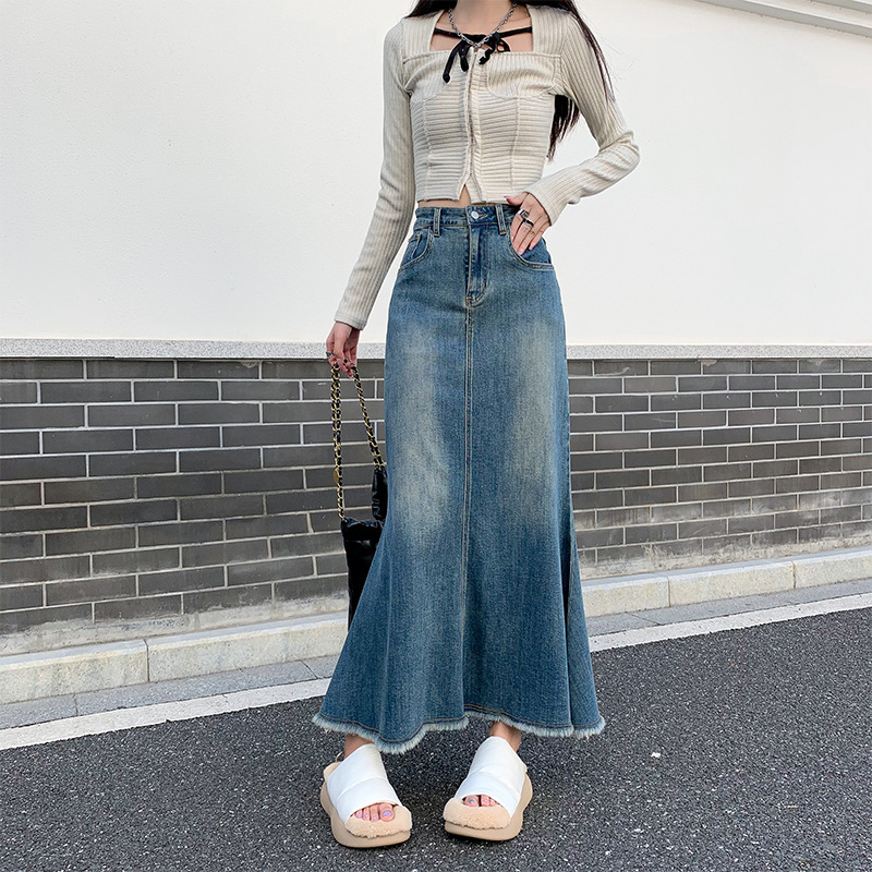 2023熱売魚尾デニムスカート女性秋レトロミディアムデザイン感小衆高腰a字ロングスカート