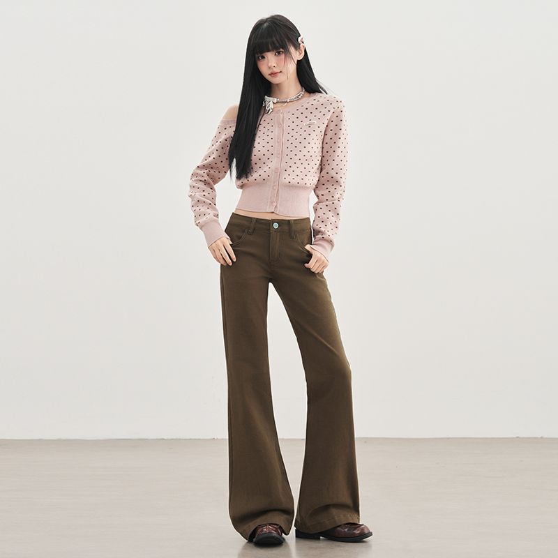 2025秋冬新款低腰弹力咖色微喇修身牛仔裤女美式复古显瘦弹力长裤