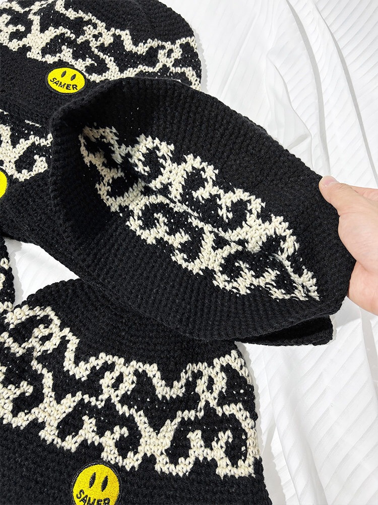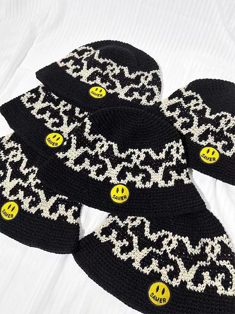アメリカの手作り鉤織ジャカード漁師帽女性笑顔布貼り毛糸帽秋冬保温盆帽ヒップホップ冷帽男
