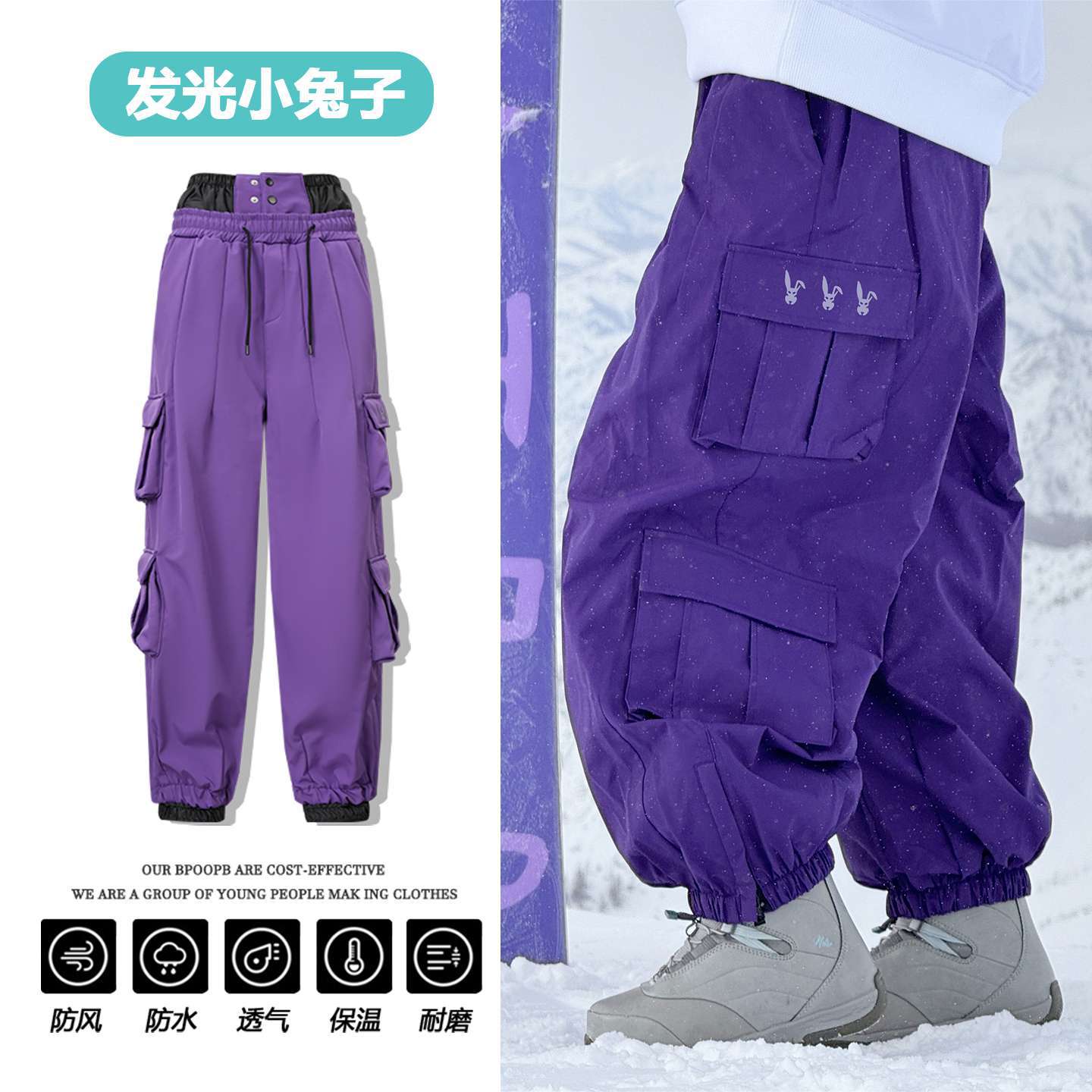 夜滑反光兔滑雪裤加绒单板双板耐磨保暖户外防水男女款雪地裤滑雪
