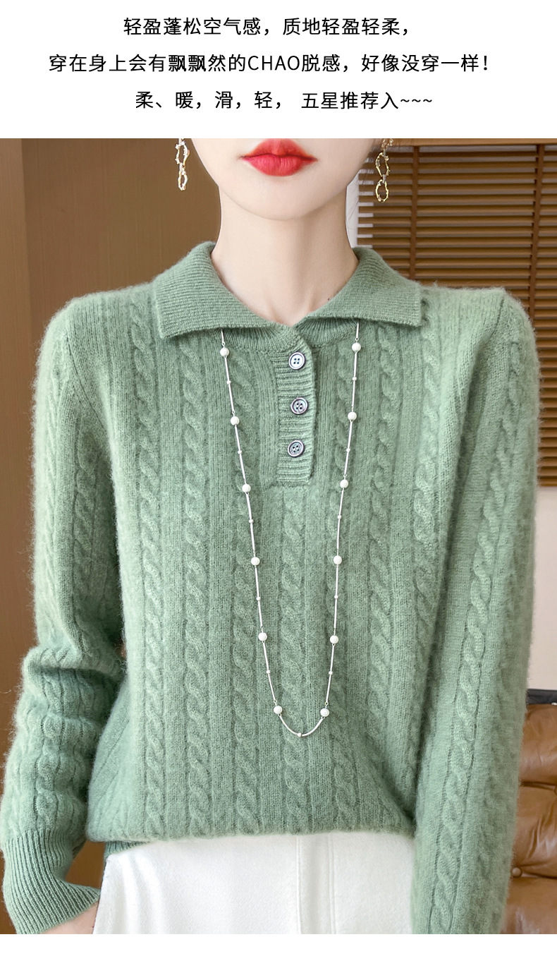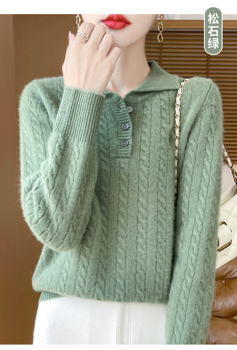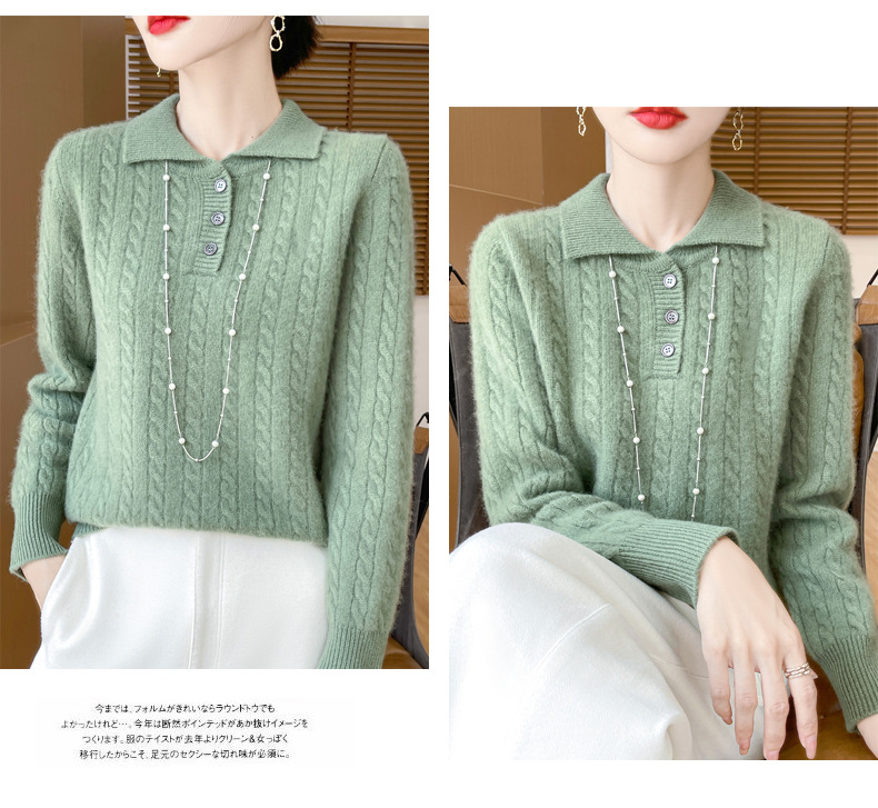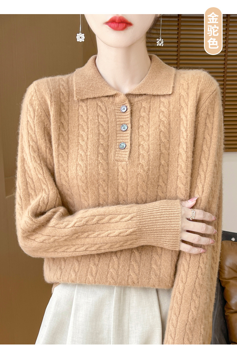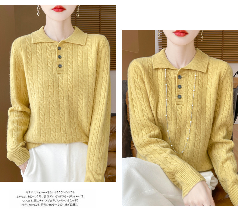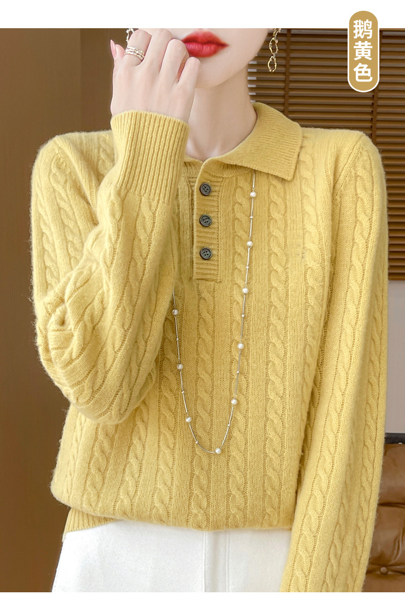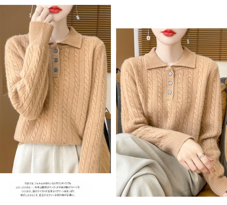 秋冬の新商品の純色のウールのシャツのPOLO襟のセーターの女性は花を捻って厚い外を着て上着を着ます。
